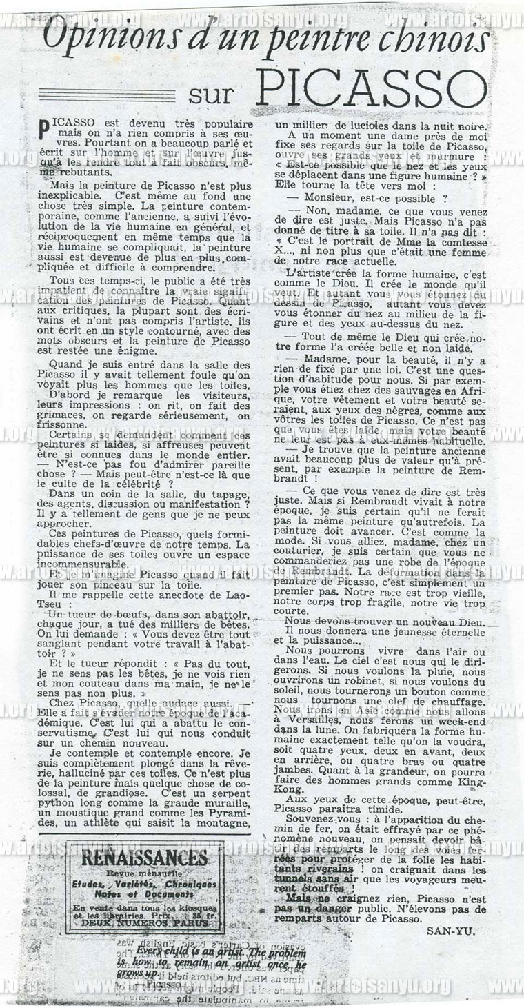 Tous ces temps-ci, le public a été très impatient de connaître la vraie signification des peintures de Picasso. Quant aux critiques, la plupart sont des écrivains et n’ont pas compris l’artiste, ils ont écrit en un style contourné, avec des mots obscurs et la peinture de Picasso est restée une énigme.