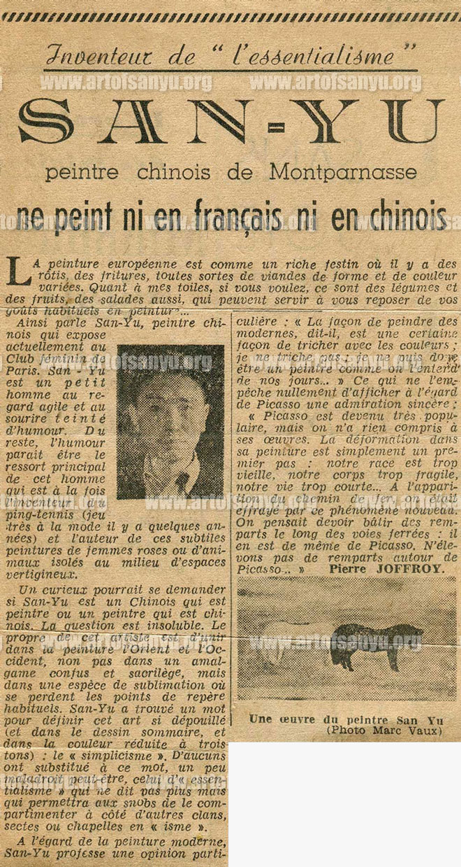 Un curieux pourrait se demander si San-Yu est un Chinois qui est peintre ou un peintre qui est chinois. La question est insoluble. Le propre de cet artiste est d’unir dans la peinture l’Orient et l’Occident, non pas dans un amalgame confus et sacrilège, mais dans une espèce de sublimation où se perdent les points de repère habituels. San-Yu a trouvé un mot pour définir cet art si dépouillé (et dans le dessin sommaire, et dans la couleur réduite à trois