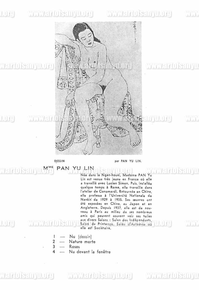 Née dans le Ngan-Houei, Madame PAN Yu Lin est venue très jeune en France où elle a travaillé avec Lucien Simon. Puis, installée quelque temps à Rome, elle travailla dans l’atelier de Conomardi. Retournée en Chine, elle professa à l’Université Nationale de Nankin de 1929 à 1935. Ses œuvres ont été exposées en Chine, au Japon et en Angleterre. Depuis 1937, elle est de nouveau à Paris au milieu de ses nombreux amis qui peuvent souvent voir ses toiles aux divers Salons : Salon des Indépendants, Salon du Printemps, Salon d’Automne où elle est Sociétaire.