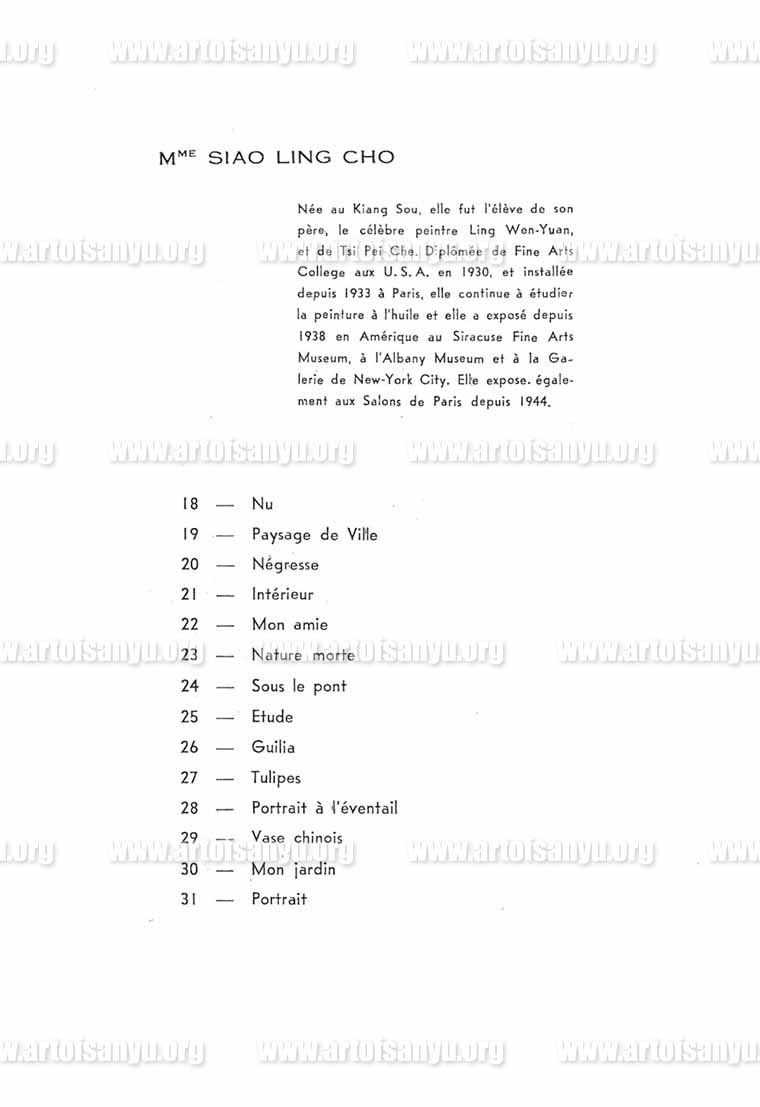 Née au Kiang Sou, elle fut l’élève de son père, le célèbre peintre Ling Wen0Yuan, et de Tsi Pei Che. Diplômée de Fine Arts College aux U.S.A. en 1930, et installée depuis 1933 à Paris, elle continue à étudier la peinture à l’huile et elle a exposé depuis 1938 en Amérique au Siracuse Fine Arts Museum, à l’Albany Museum et à la Galerie de New-York City. Elle expose également aux Salons de Paris depuis 1944.