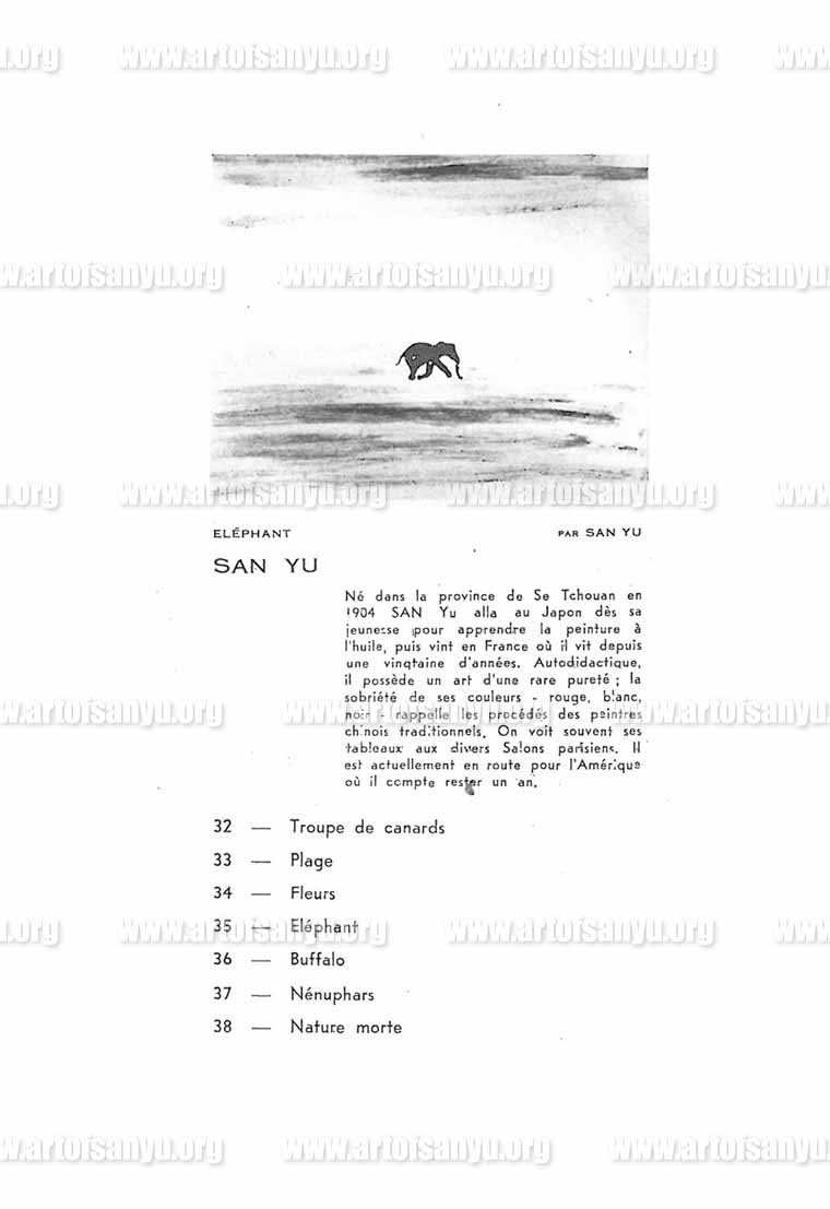 Né dans la province de Se Tchouan en 1904 SAN Yu alla au Japon dès sa jeunesse pour apprendre la peinture à l’huile, puis vint en France où il vit depuis une vingtaine d’années. Autodidactique, il possède un art d’une rare pureté ; la sobriété de ses couleurs - rouge, blanc, noir - rappelle les procédés des peintres chinois traditionnels. On voit souvent ses tableaux aux divers Salons parisiens. Il est actuellement en route pour l’Amérique où il compte rester un an.