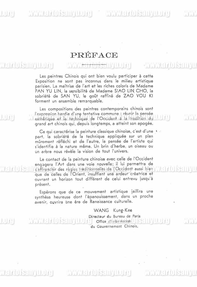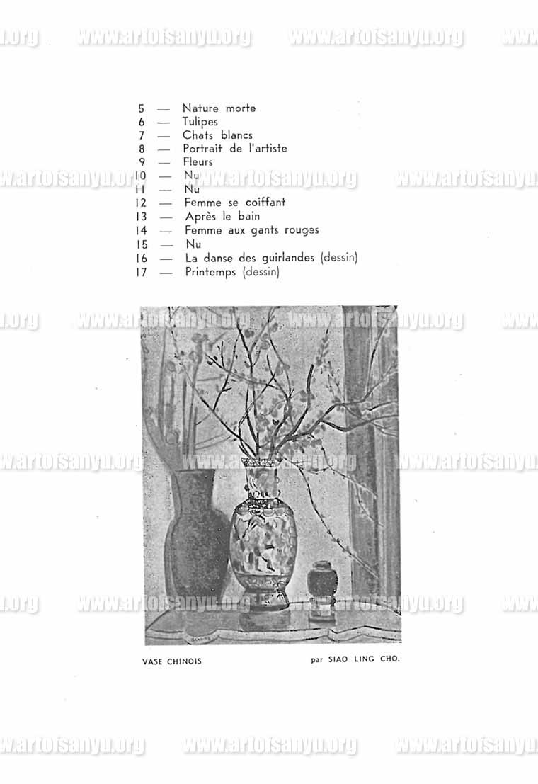 Les peintres Chinois qui ont bien voulu participer à cette Exposition ne sont pas inconnus dans le milieu artistique parisien. La maîtrise de l’art et les riches coloris de Madame PAN YU LIN, la sensibilité de Madame SIAO LIN CHO, la sobriété de SAN YU, le goût raffiné de ZAO VOU KI forment un ensemble remarquable.