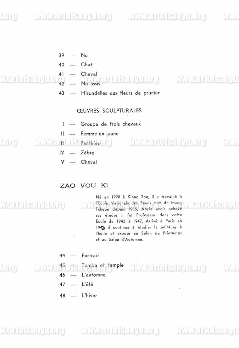 Né dans la province de Se Tchouan en 1904 SAN Yu alla au Japon dès sa jeunesse pour apprendre la peinture à l’huile, puis vint en France où il vit depuis une vingtaine d’années. Autodidactique, il possède un art d’une rare pureté ; la sobriété de ses couleurs - rouge, blanc, noir - rappelle les procédés des peintres chinois traditionnels. On voit souvent ses tableaux aux divers Salons parisiens. Il est actuellement en route pour l’Amérique où il compte rester un an.