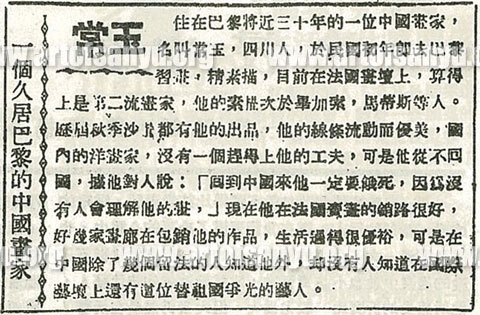 住在巴黎將近三十年的一位中國畫家,名叫常玉,四川人,於民國初年即去巴黎習畫,精素描,目前在法國畫壇上,算得上是第二流畫家,他的素描次於畢加索,馬蒂斯等人。歷屆秋季沙龍都有他的出品,他的線條流動而優美,國內的洋畫家,沒有一個趕得上他的功夫,可是他從不回國,據他對人說:「回到中國來他一定要餓死,因為沒有人會理解他的畫,」現在他在法國賣畫的銷路很好,好幾家畫廊在包銷他的作品,生活過得很優裕,可是在中國除了幾個留法的人知道他外,卻沒有人知道在國際藝壇上還有這位替祖國爭光的藝人。