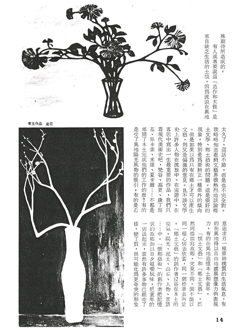 他畫的花卉都植根在一個小方盆裡,這一點很具象徵意義,可說很能反映他的「失去泥土」的心理。試看花的大小和盆的大小,兩者是完全不能配合約。像蓮花的一幅,花葉的柄那樣修長,裊娜交錯,但是藕根如何擠得進那一個小小的淺盆?就繪畫表現上說,似乎也就該如此,只能是如此。有了這樣的小方盆的約束、緊縮,而逼出「盆」、「魂」、「痕」、「昏」的戰慄的情調來。倒是我們不能想像把盆改畫為正確的大小,更不能想像他把花畫在泥土地上。