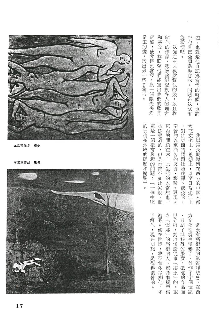 我知道有人很欣賞他的中畫,並月收藏他的作品,我盼望能交換各人的理會和感受,我盼望他們能寫出他們的欣賞經驗,使我得到啟發,換一個眼光去看常玉的畫,讀出另一些意義來。