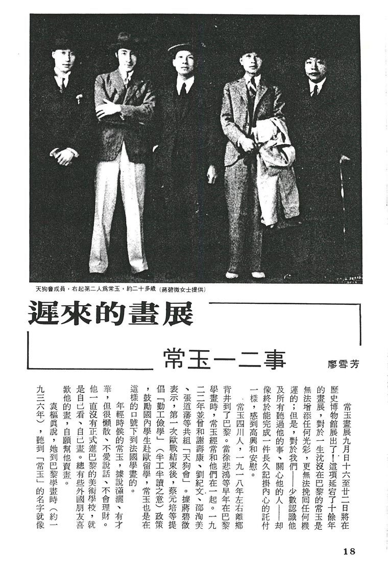 常玉畫展九月十六日至廿二日將在歷史博物館展出了!這項延宕了十餘年的畫展,對於一生沈沒在巴黎的常玉是無法增添任何光彩,更無法挽回任何機運的;但是,對於我們——少數認識他及所有聽過他的事、關心他的人——卻像終於能完成一件長久記掛內心的托付一樣,感到高興和安慰。