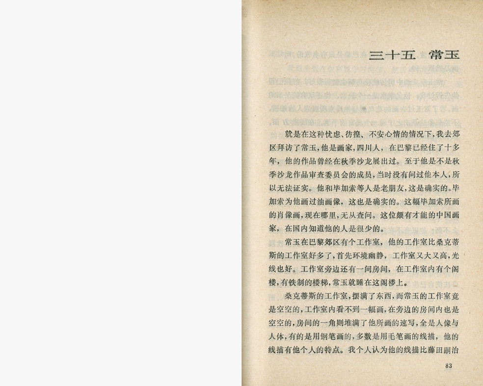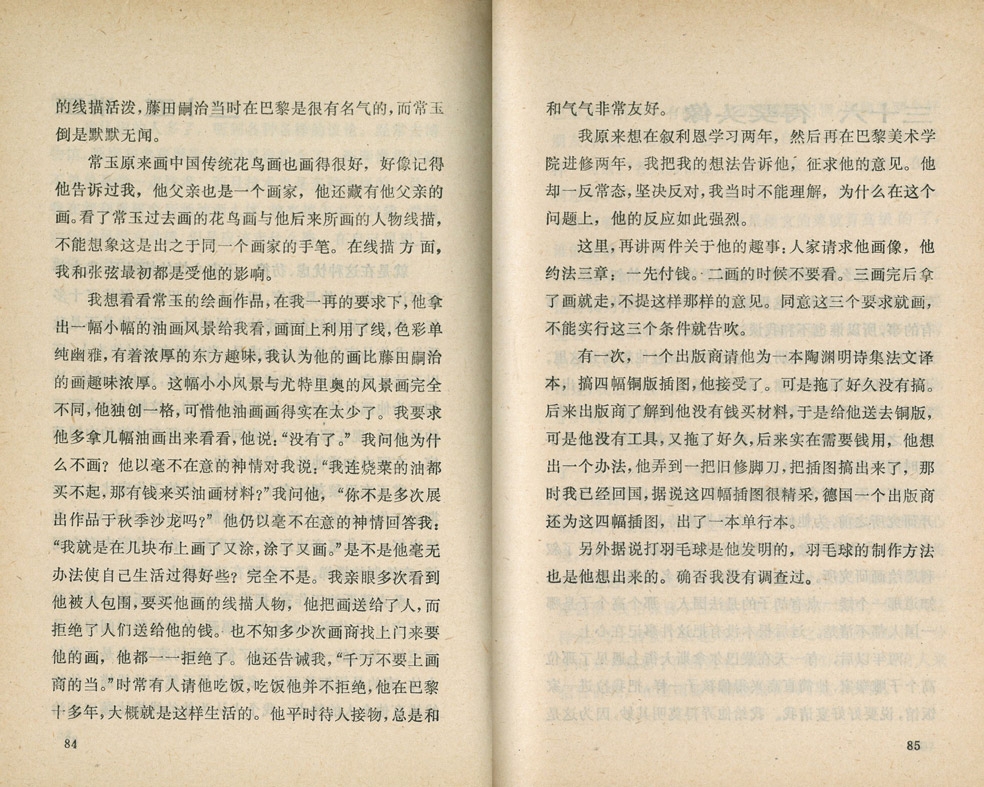 我想看看常玉的繪畫作品,在我一再的要求下,他拿出一幅小幅的油畫風景給我看,畫面上利用了線,色彩單純幽雅,有著濃厚的東方趣味,我認為他的畫比藤田嗣治的畫趣味濃厚。這幅小小風景與尤特里奧的風景畫完全不同,他獨創一格,可惜他油畫畫得實在太少了。我要求他多拿幾幅油畫出來看看,他說:「沒有了。」我問他為什麼不畫?他以毫不在意的神情對我說:「我連燒菜的油都買不起,那有錢來買油畫材料?」我問他,「你不是多次展出作品於秋季沙龍嗎?」他仍以毫不在意的神情回答我:「我就是在幾塊布上畫了又塗,塗了又畫。」是不是他毫無辦法使自己生活過得好些?完全不是。我親眼多次看到他被人包圍,要買他畫的線描人物,他把畫送給了人,而拒絕了人們送給他的錢。也不知多少次畫商找上門來要他的畫,他都一一拒絕了。他還告誡我,「千萬不要上畫商的當。」時常有人請他吃飯,吃飯他並不拒絕,他在巴黎十多年,大概就是這樣生活的。他平時待人接物,總是和和氣氣非常友好。