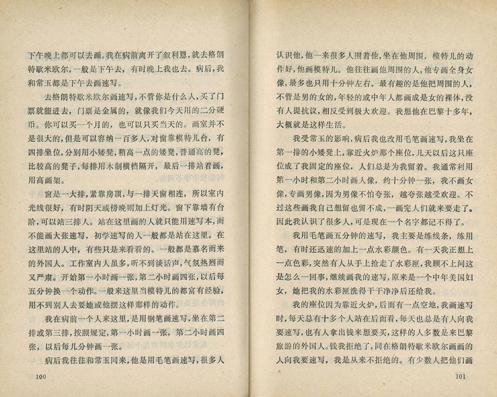 我的座位因為靠近火爐,後面有一點空地,我畫速寫時,每天總有十多個人站在後面看,每天也總是有人向我要速寫,也有人拿出錢來想要買,這樣的人多數是來巴黎旅遊的外國人。錢我拒絕了,同在格朗特歇米歐爾畫畫的人向我要速寫,我是從來不拒絕的。有少數人把他們畫的小品畫,寫上自己的名字送給我作為紀念,我那時沒有想到互相交換,假若交換一下我可以擁有一筆可觀的財富。不過這也沒有用,後來連我自己的畫也保留不住,毀了。