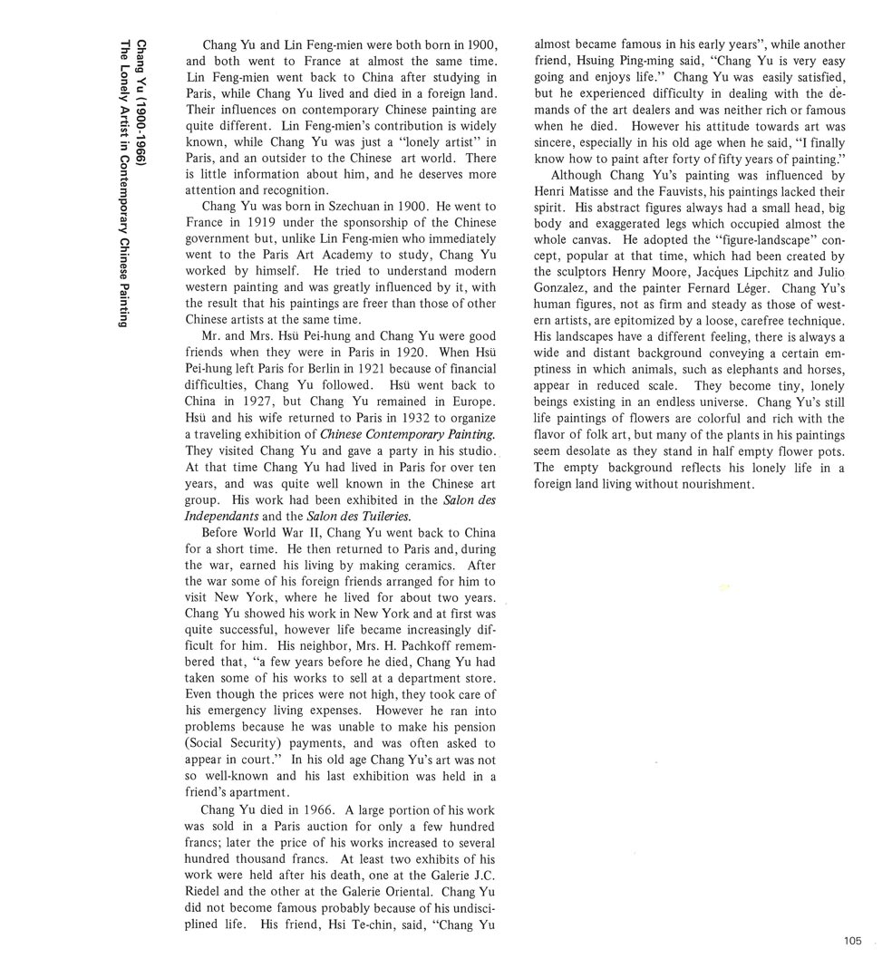 Chang Yu and Lin Feng-mien were both born in 1900, and both went to France at almost the same time. Lin Feng-mien went back to China after studying in Paris, while Chang Yu lived and died in a foreign land. Their influences on contemporary Chinese painting are quite different. Lin Feng-mien’s contribution is widely known, while Chang Yu was just a “lonely artist” in Paris, and an outsider to the Chinese art world. There is little information about him, and he deserves more attention and recognition.