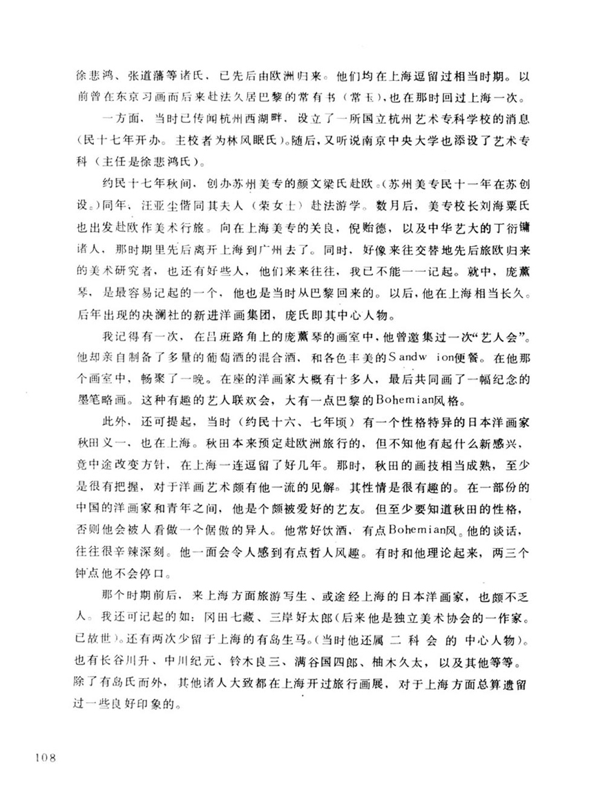 我記得有一次,在呂班路角上的龐薰琴的畫室中,他曾邀集過一次「藝人會」他卻親自製備了多量葡萄的混合酒,和各色豐美的Sandw ion便餐。在他那個室中,暢聚了一晚。在座的洋畫家大概有十多人,最後共同畫了一幅紀念的墨筆略畫。這種有趣的藝人聯歡會,大有一點巴黎的Bohemian風格。