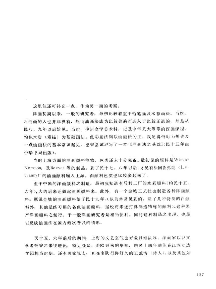 當時上海方面的油畫顏料等物,色類還未十分完備。最初見的顏料是Winsor Nemton,及Reeves 等的製品。到了民十七、八年以後,才見有法國魯弗朗(Letranc)廠的油畫顏料輸入上海。而顏料色類也比較多起來了。