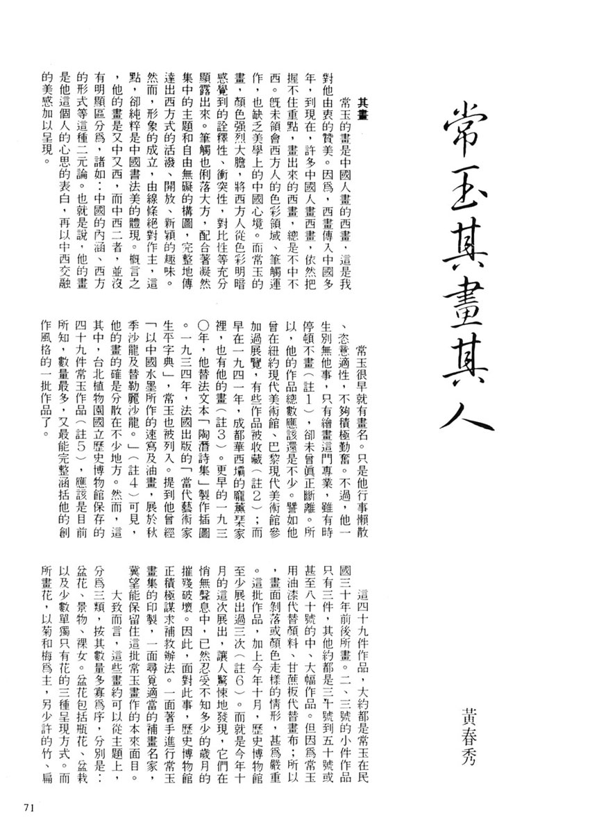 註5 歷史博物館的四十九件常玉品,分三次入藏。先是五十七年十月,由教育部撥交,即席德進文中提到的「我在巴黎時,聽說我們教育部(當時是黃季陸部長)匯了四百美金給他作路費,要他回台灣開畫展講學。他也交了四十幅油畫先由我們駐法大使館寄運回台北。」(按:此處所云駐法大使館應是駐比大使館之誤)這批作品,共四十二件。再即七十五年入藏五件(瓶花、馬、小魚、小魚、菊花),據說是得自曾任駐比大使的郭有守先生,亦由教育部撥交。第三次即七十九年入藏的二件,分別是人像和盆景。