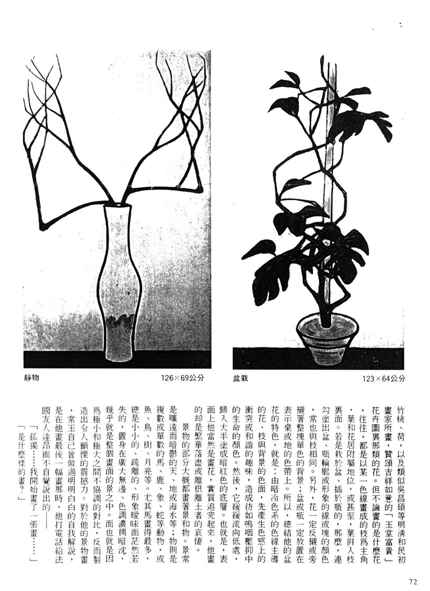 註5 歷史博物館的四十九件常玉品,分三次入藏。先是五十七年十月,由教育部撥交,即席德進文中提到的「我在巴黎時,聽說我們教育部(當時是黃季陸部長)匯了四百美金給他作路費,要他回台灣開畫展講學。他也交了四十幅油畫先由我們駐法大使館寄運回台北。」(按:此處所云駐法大使館應是駐比大使館之誤)這批作品,共四十二件。再即七十五年入藏五件(瓶花、馬、小魚、小魚、菊花),據說是得自曾任駐比大使的郭有守先生,亦由教育部撥交。第三次即七十九年入藏的二件,分別是人像和盆景。
