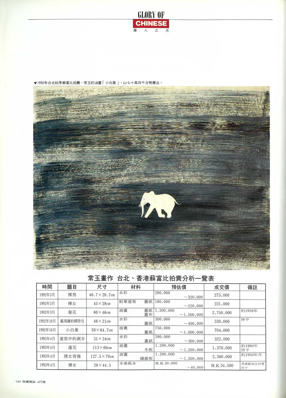 常玉在一九六六年過世後留下約百餘件作品,數量最多的二個藏家是常玉的好友,法國巴黎的艾伯蒂.達昂(Albert Dahan)和台北的國立歷史博物館(約藏四十幅油畫),流傳在其他藏家手中的作品應是不多的。在他死後那麼多年,作品浮上國際枱面,並且在十一個月之間,台北一地就有八幅作品在拍賣會上流通(香港、美國地區未計算在內),確實是不容易的事。