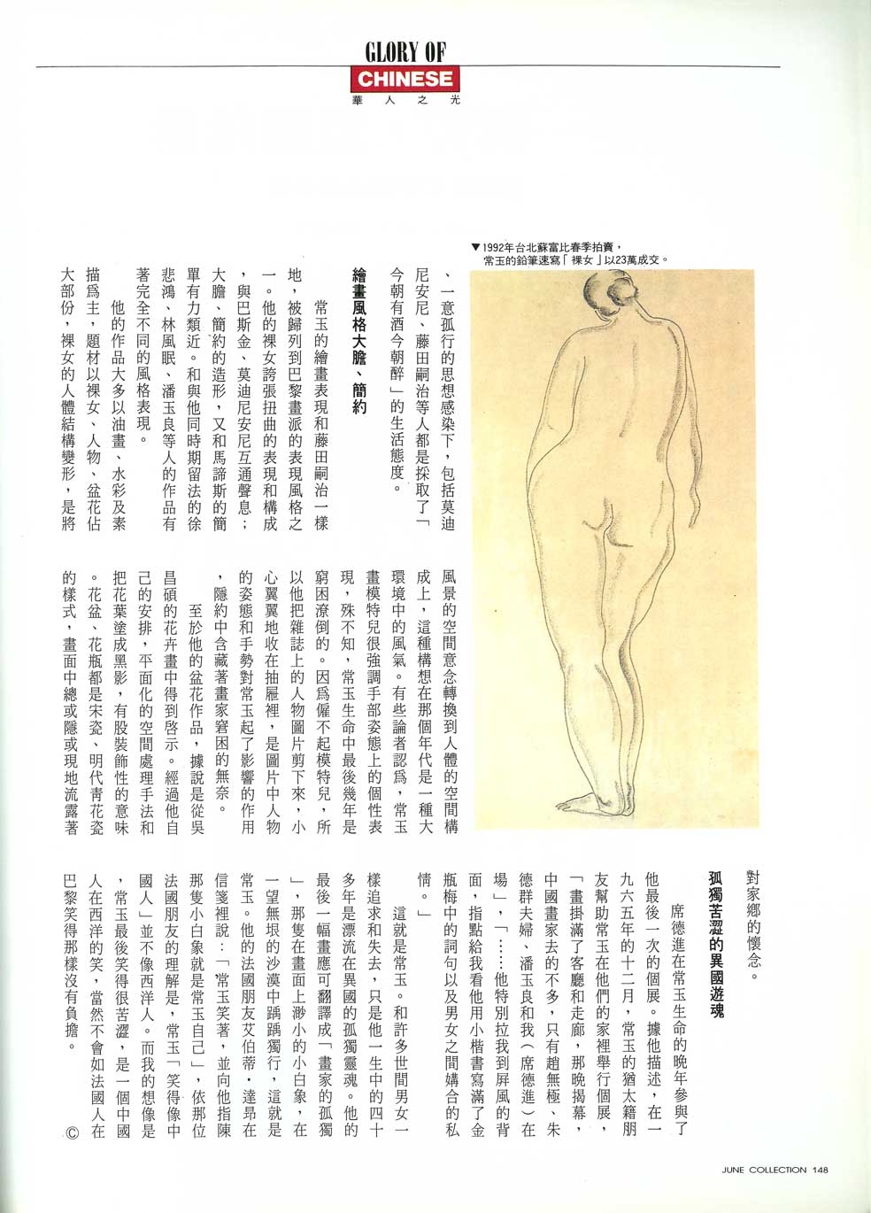 常玉(一九〇〇~一九六六年)在藝術資訊還不發達的年代去世,所以大眾對他的認識至少遲了十年以上。從一九七〇年代中期到一九九〇年代,斷斷續續在雜誌上出現介紹他的文章,概括地說,他的繪畫成就是被肯定的。
