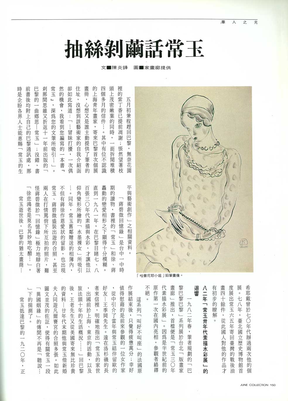 五月初兼程趕回巴黎,無奈花園裡的紫丁香已提前凋謝;悵然望著枝頭上茂密嫩葉的同時,一面拆閱堆積四個多月的信件…。其中有位不認識的上海青年畫家,寄來巴黎首次個展畫冊,心想又是誰主動提供了筆者的住址,沒想到該藝術家的自我介紹函卻如此寫道:「…冒昧打擾,一次偶然的機會,我看到您編寫的一本書『常玉』,深為您的文筆所吸引…」。剎那間思維又折返十一年前出版的「巴黎的一曲鄉思——常玉」;沒錯,書前書後均附上自己的巴黎通訊處,那時是企盼各界人士能惠賜「常玉的生平與藝術創作」之相關資料。