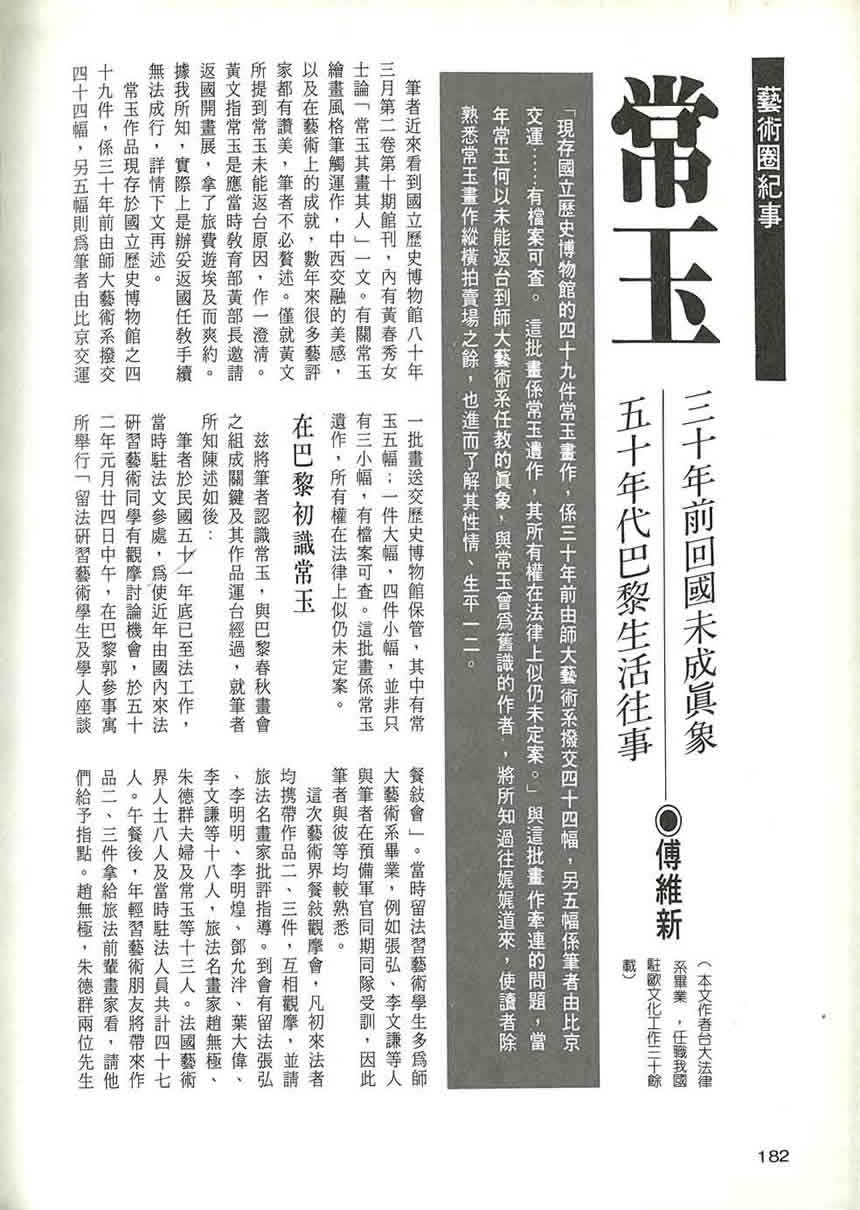 「現存國立歷史博物館的四十九件常玉畫作,係三十年前由師大藝術系撥交四十四幅,另五幅係筆者由比京交運……有檔案可查。這批畫係常玉遺作,其所有權在法律上似仍未定案。」與這批畫作牽連的問題,當年常玉何以未能返台到師大藝術系任教的真象,與常玉曾為舊識的作者,將所知過往娓娓道來,使讀者除熟悉常玉畫作縱橫拍賣場之餘,也進而了解其性情、生平一二。