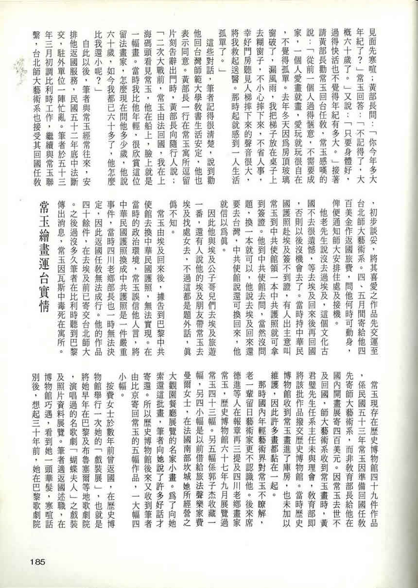 筆者近來看到國立歷史博物館八十年三月第二卷第十期館刊,內有黃春秀女士論「常玉其畫其人」一文。有關常玉繪畫風格筆觸運作,中西交融的美感,以及在藝術上的成就,數年來很多藝評家都有讚美,筆者不必贅述。僅就黃文所提到常玉未能返台原因,作一澄清。黃文指常玉是應當時教育部黃部長邀請返國開畫展。拿了旅費遊埃及而爽約。據我所知,實際上是辦妥返國任教手續無法成行,詳情下文再述。
