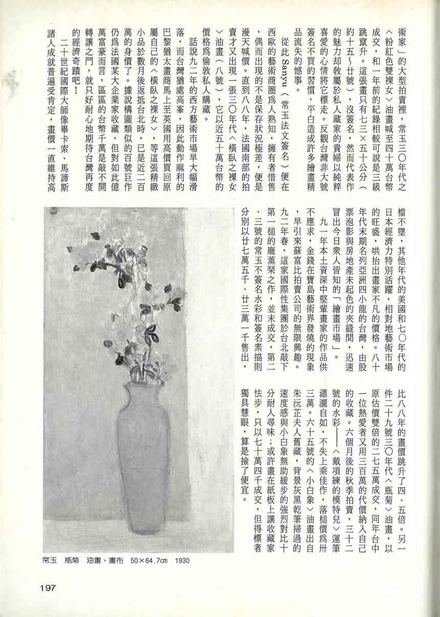 二次大戰後,常玉作品首次出現在拍賣市場該是一九八三年的巴黎國立藝術品拍賣中心,那張五〇年代裸女油畫的落槌價為二萬法郎(加上稅約台幣十二萬),當時筆者曾於民生報作精簡的常玉畫價報導。回想十餘年前,知道「常玉」的不外乎文藝圈的朋友,一般人幾乎連名字都沒印象,更遑論畫作價格,更何況彼時島內尚無所謂真正的「繪畫市場」。
