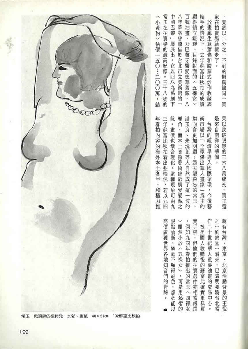二次大戰後,常玉作品首次出現在拍賣市場該是一九八三年的巴黎國立藝術品拍賣中心,那張五〇年代裸女油畫的落槌價為二萬法郎(加上稅約台幣十二萬),當時筆者曾於民生報作精簡的常玉畫價報導。回想十餘年前,知道「常玉」的不外乎文藝圈的朋友,一般人幾乎連名字都沒印象,更遑論畫作價格,更何況彼時島內尚無所謂真正的「繪畫市場」。