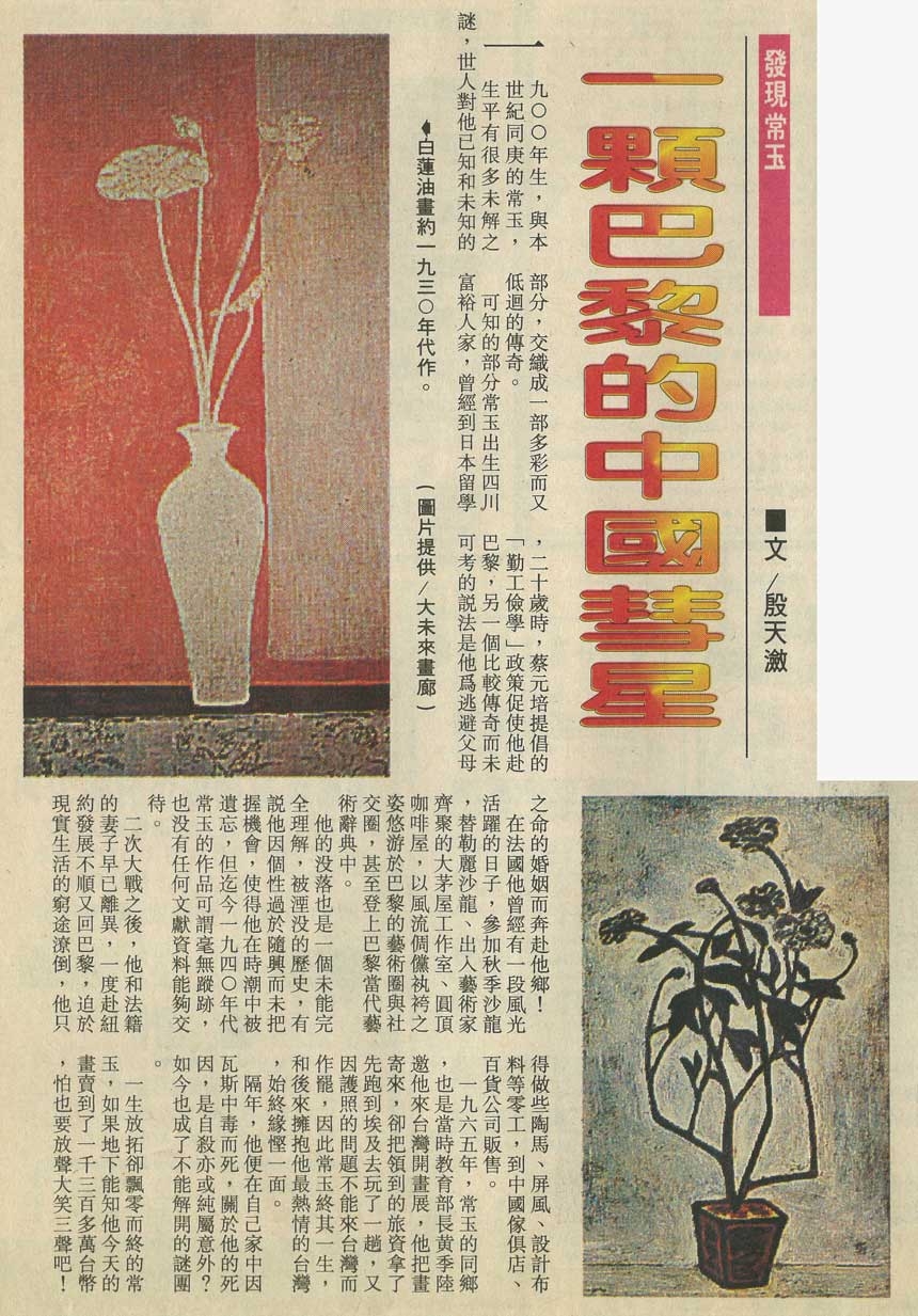 一九六五年,常玉的同鄉,也是當時教育部長黃季陸邀他來台灣開畫展,他把畫寄來,卻把領到的旅資拿了先跑到埃及去玩了一趟,又因護照的問題不能來台灣而作罷,因此常玉終其一生,和後來擁抱他最熱情的台灣,始終緣慳一面。