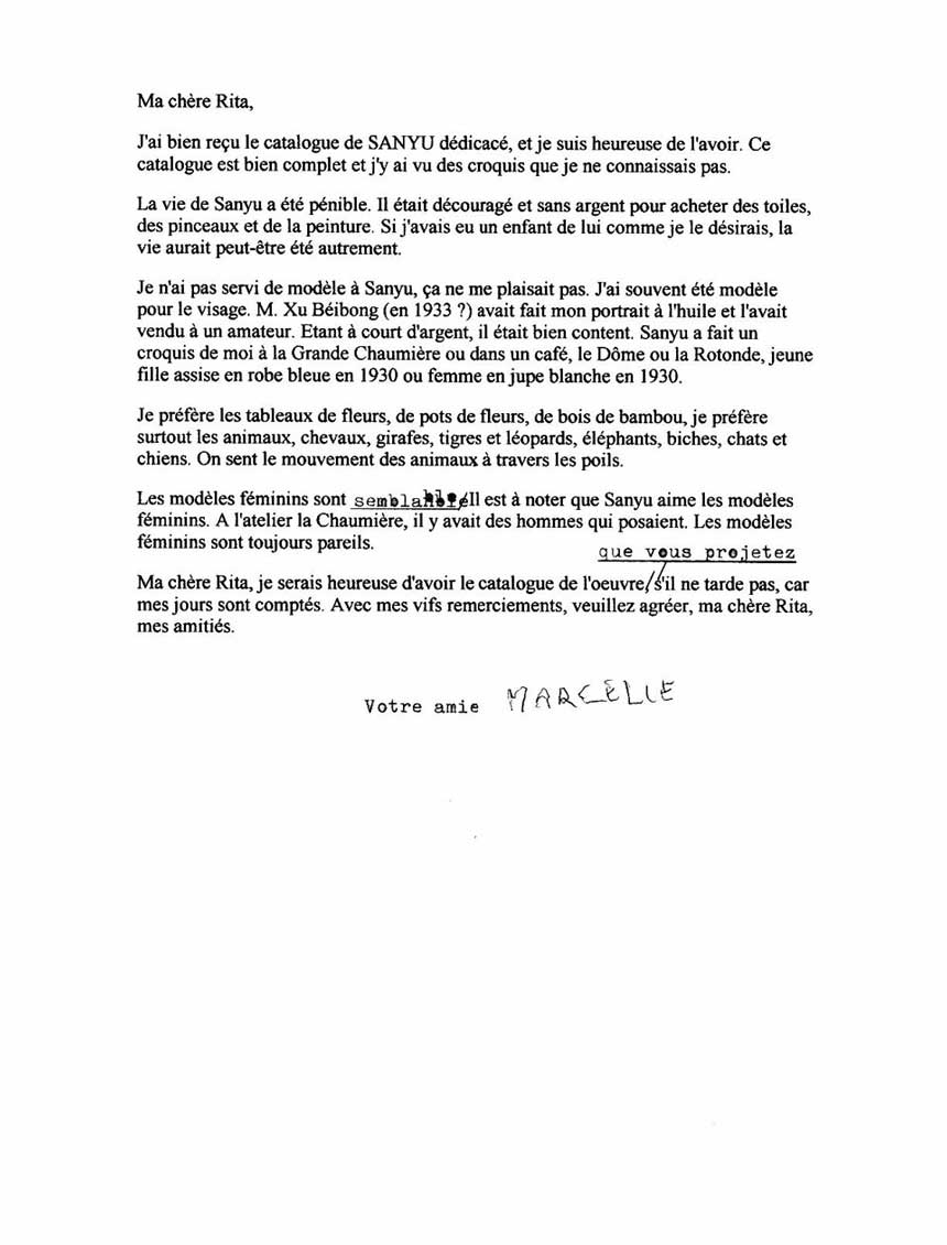 Je n’ai pas servi de modèle à Sanyu, ça ne me plaisait pas. J’ai souvent été modèle pour le visage. M. Xu Béihong (en 1933?) avait fait mon portrait à l’huile et l’avait vendu à un amateur. Etant à court d’argent, il était bien content. Sanyu a fait un croquis de moi à la Grande Chaumière ou dans un café, le Dôme ou la Rotonde, jeune fille assise en robe bleue en 1930 ou femme en jupe blanche en 1930.
