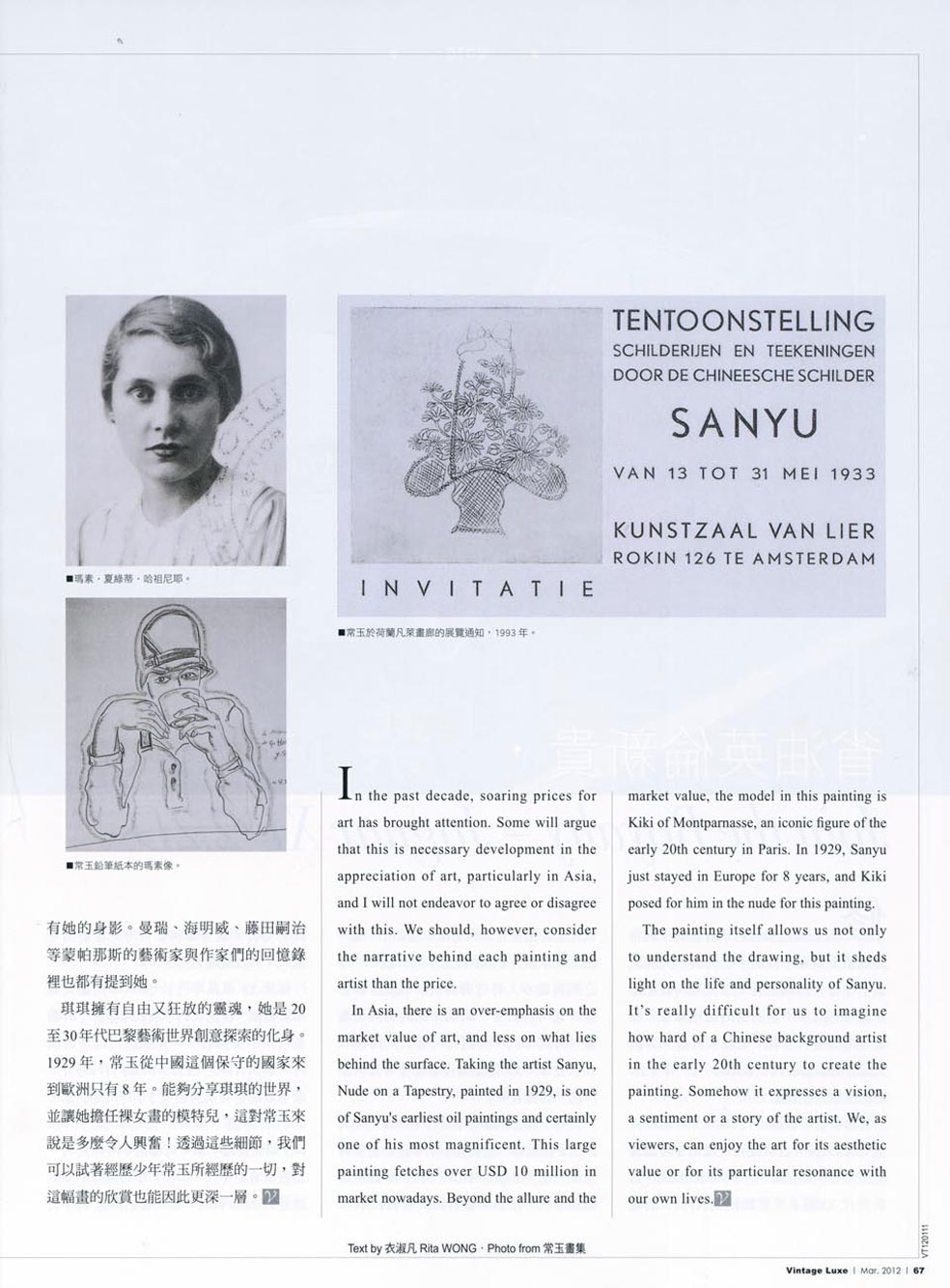 這幅大型作品在現今藝術品拍賣市場上絕對可以喊出超過千萬美金的高價。但在作品本身的吸引力與市場價值之外,我們發現這幅畫的模特兒竟是廿世紀早期巴黎的指標性人物——蒙帕那斯的琪琪!知名的琪琪是許多前衛藝術家的模特兒、朋友與情人,當時幾乎所有的作品裡都有她的身影。曼瑞、海明威、藤田嗣治等蒙帕那斯的藝術家與作家們的回憶錄裡也都有提到她。