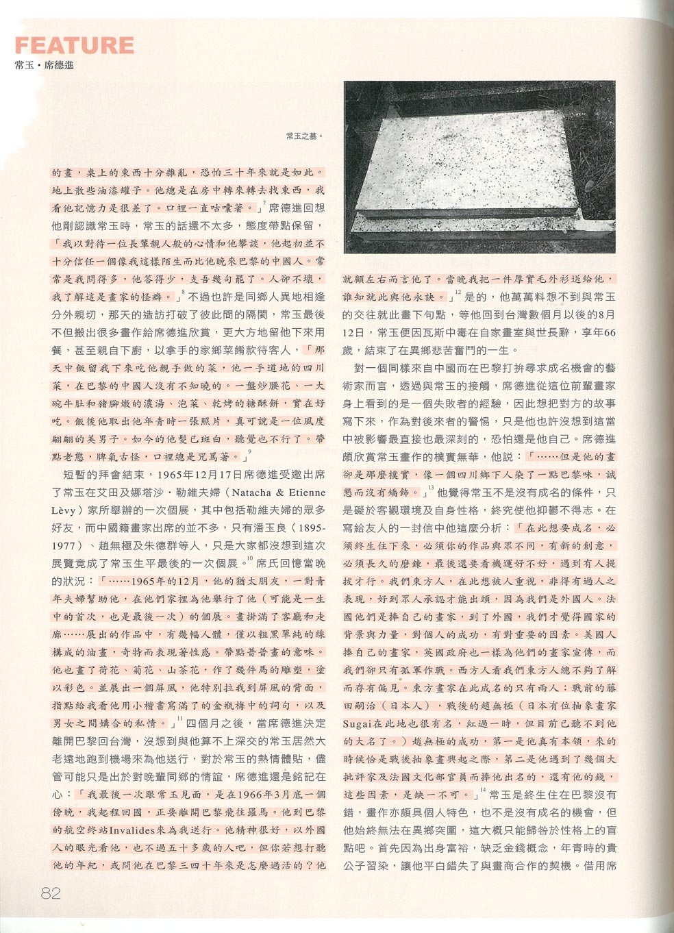 回到台灣之後,席氏在1970年代全力投入發掘鄉土與大自然之美,把壓抑多時的思鄉情結亳無保留的傾注在作品之中,無心插柳的在國內掀起了一波排山倒海的鄉土文化浪潮,但他一直未曾忘懷當年在巴黎與常玉結交的點滴,以及他心裏頭想把常玉的故事寫出來的承諾,終於他所撰寫的〈一生沉沒在巴黎的中國老畫家常玉〉一文,發表在1971年5月號的《雄獅美術月刊》上,為國內首度出現專題介紹常玉的文章。常玉這個名字對於當時台灣的藝術愛好者而言是相對陌生的,透過席氏生動的文字敍述,讓讀者對這位旅法畫家有了初步的印象。席氏的文章,對一位在異鄉默默無聞,遽然驟逝的中國老畫家而言,著實起了關鍵的鈎沉作用,同時亦見證了兩人之間短暫卻真摯的珍貴情誼。