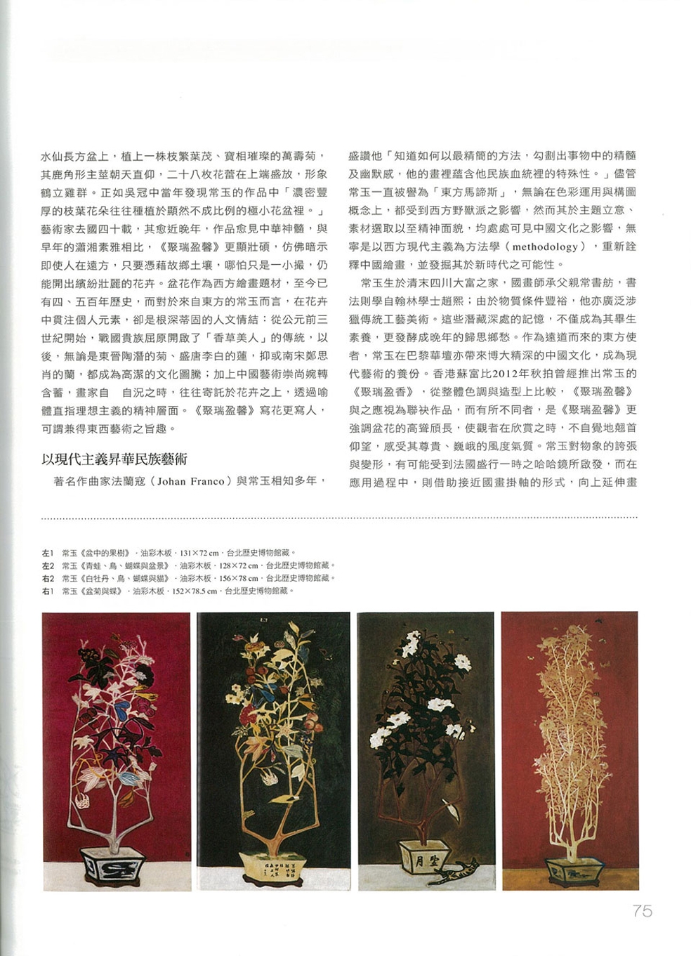 常玉在民初畫壇地位崇高,不論是同儕之張大千、潘玉良,抑或後來者趙無極、朱德群、吳冠中,均公推為旅法華人之首,吳冠中在散文《說常玉》中回憶巴黎舊事,曾經感嘆:「我覺得常玉自己就是盆景,巴黎花圃裡的東方盆景。」恰好道出《聚瑞盈馨》的自傳性質。花卉是常玉長伴一生的題材,自三〇年代起,常玉即以油彩創作盆花,五〇年代以後,更大膽融入想像與臆造,使其主觀元素愈加突出。《聚瑞盈馨》造型雍容瑰麗,在一方小巧精緻的青花水仙長方盆上,植上一株枝繁葉茂、寶相璀璨的萬壽菊,其鹿角形主莖朝天直仰,二十八枚花蕾在上端盛放,形象鶴立雞群。正如吳冠中當年發現常玉的作品中「濃密豐厚的枝葉花朵往往種植於顯然不成比例的極小花盆裡。」藝術家去國四十載,其愈近晚年,作品愈見中華神髓,與早年的瀟湘素雅相比,《聚瑞盈馨》更顯壯碩,彷彿暗示即使人在遠方,只要憑藉故鄉土壤,哪怕只是一小撮,仍能開出繽紛壯麗的花卉。盆花作為西方繪畫題材,至今已有四、五百年歷史,而對於來自東方的常玉而言,在花卉中貫注個人元素,卻是根深蒂固的人文情結:從公園前三世紀開始,戰國貴族屈原開啟了「香草美人」的傳統,以後,無論是東晉陶潛的菊、盛唐李白的蓮,抑或南宋鄭思肖的蘭,都成為高潔的文化圖騰;加上中國藝術崇尚婉轉含蓄,畫家自 自況之時,往往寄託於花卉之上,透過喻體直指理想主義的精神層面。《聚瑞盈馨》寫花更寫人,可謂兼得東西藝術之旨趣。