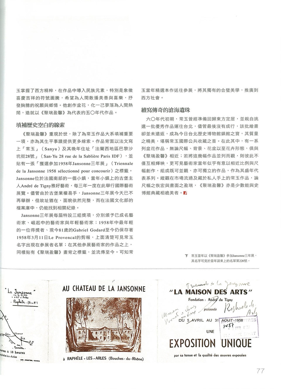 Jansonne三年展每屆特設三組獎項,分別頒予已成名藝術家、崛起中的藝術家與年輕藝術家;1958年中最年輕的一位得獎者、現今81歲的Gabriel Godard至今仍保存著1958年3月11日Le Provencal的剪報,上面清楚可見常玉名字出現在參展者名單;在其他參展藝術家的作品之上,同樣貼有《聚瑞盈馨》畫背之標籤,並流傳至今。可知常玉當年精選本作送往參展,將其獨有的合壁美學,推廣到西方社會。