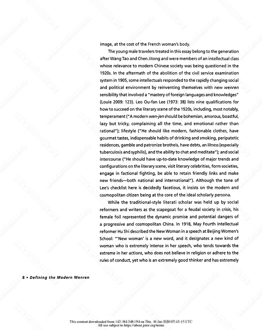 The young male travelers treated in this essay belong to the generation after Wang Tao and Chen Jitong and were members of an intellectual class whose relevance to modern Chinese society was being questioned in the 1920s. In the aftermath of the abolition of the civil service examination system in 1905, some intellectuals responded to the rapidly changing social and political environment by reinventing themselves with new wenren sensibility that involved a “mastery of foreign languages and knowledges” (Louie 2009: 123). Leo Ou-fan Lee (1973: 38) lists nine qualifications for how to succeed on the literary scene of the 1920s, including, most notably, temperament (“A modern wen-jen should be bohemian, amorous, boastful, lazy but tricky, complaining all the time, and emotional rather than rational”); lifestyle (“He should like modem, fashionable clothes, have gourmet tastes, indispensable habits of drinking and smoking, peripatetic residences, gamble and patronize brothels, have debts, an illness [especially tuberculosis and syphilis], and the ability to chat and meditate”); and social intercourse (“He should have up-to-date knowledge of major trends and configurations on the literary scene, visit literary celebrities, form societies, engage in factional fighting, be able to retain friendly links and make new friends—both national and international”). Although the tone of Lee’s checklist here is decidedly facetious, it insists on the modem and cosmopolitan citizen being at the core of the ideal scholarly persona.
