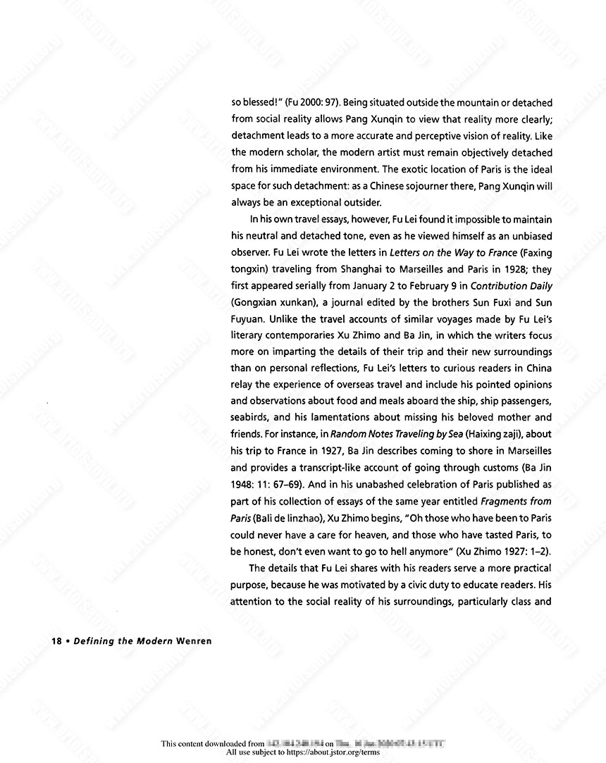 In his own travel essays, however, Fu Lei found it impossible to maintain his neutral and detached tone, even as he viewed himself as an unbiased observer. Fu Lei wrote the letters in Letters on the Way to France (Faxing tongxin) traveling from Shanghai to Marseilles and Paris in 1928; they first appeared serially from January 2 to February 9 in Contribution Daily (Gongxian xunkan), a journal edited by the brothers Sun Fuxi and Sun Fuyuan. Unlike the travel accounts of similar voyages made by Fu Lei’s literary contemporaries Xu Zhimo and Ba Jin, in which the writers focus more on imparting the details of their trip and their new surroundings than on personal reflections, Fu Lei’s letters to curious readers in China relay the experience of overseas travel and include his pointed opinions and observations about food and meals aboard the ship, ship passengers, seabirds, and his lamentations about missing his beloved mother and friends. For instance, in Random Notes Traveling by Sea (Haixing zaji), about his trip to France in 1927, Ba Jin describes coming to shore in Marseilles and provides a transcript-like account of going through customs (Ba Jin 1948: 11: 67–69). And in his unabashed celebration of Paris published as part of his collection of essays of the same year entitled Fragments from Paris (Bali de linzhao), Xu Zhimo begins, “Oh those who have been to Paris could never have a care for heaven, and those who have tasted Paris, to be honest, don’t even want to go to hell anymore” (Xu Zhimo 1927: 1–2).