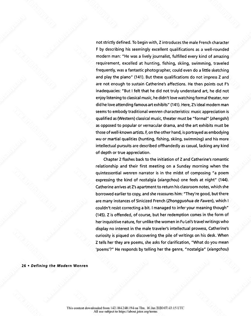 Chapter 2 flashes back to the initiation of Z and Catherine’s romantic relationship and their first meeting on a Sunday morning when the quintessential wenren narrator is in the midst of composing “a poem expressing the kind of nostalgia (xiangchou) one feels at night” (144). Catherine arrives at Z’s apartment to return his classroom notes, which she borrowed earlier to copy, and she reassures him: “They’re good, but there are many instances of Sinicized French (Zhongguohua de Fawen), which I couldn’t resist correcting a bit. I managed to infer your meaning though” (145). Z is offended, of course, but her redemption comes in the form of her inquisitive nature, for unlike the women in Fu Lei’s travel writings who display no interest in the male traveler’s intellectual prowess, Catherine’s curiosity is piqued on discovering the pile of writings on his desk. When Z tells her they are poems, she asks for clarification, “What do you mean ‘poems’?” He responds by telling her the genre, “nostalgia” (xiangchou) (146), which inspires her demand that he translate the poems for her to hear.
