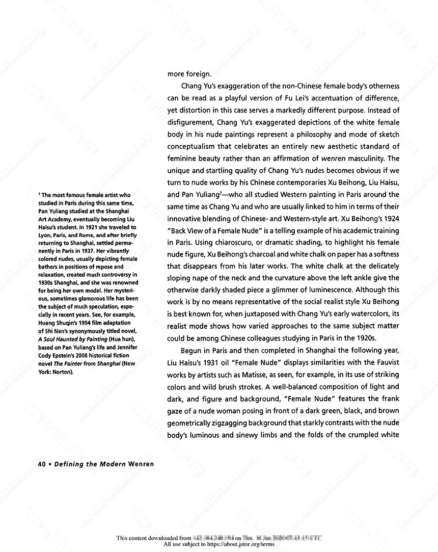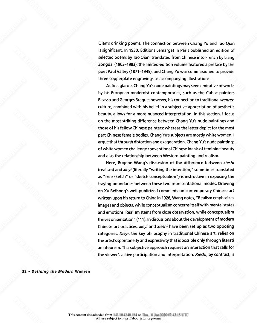 Along with Pan Yuliang (1899–1977), who also remained in Paris, Chang Yu was an exception among the Chinese artists who studied abroad in the West. His “failure” has been explained by way of his eccentric personality and his bohemian lifestyle, and his consorting with Parisian “locals” and contemporary Western artists, implying his isolation from Chinese contemporaries. To read Chang Yu’s lack of financial success (and therefore career) as one of “missed opportunities” loses sight of the key role that his wenren sensibility played in his artistic choices.