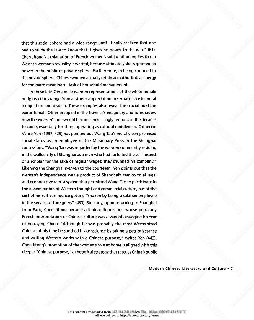 Yeh, Catherine Vance. 1997. “The Life-Style of Four Wenren in Late Qing Shanghai.” Harvard Journal of Asiatic Studies 57, no. 2 (Dec.): 419–470.