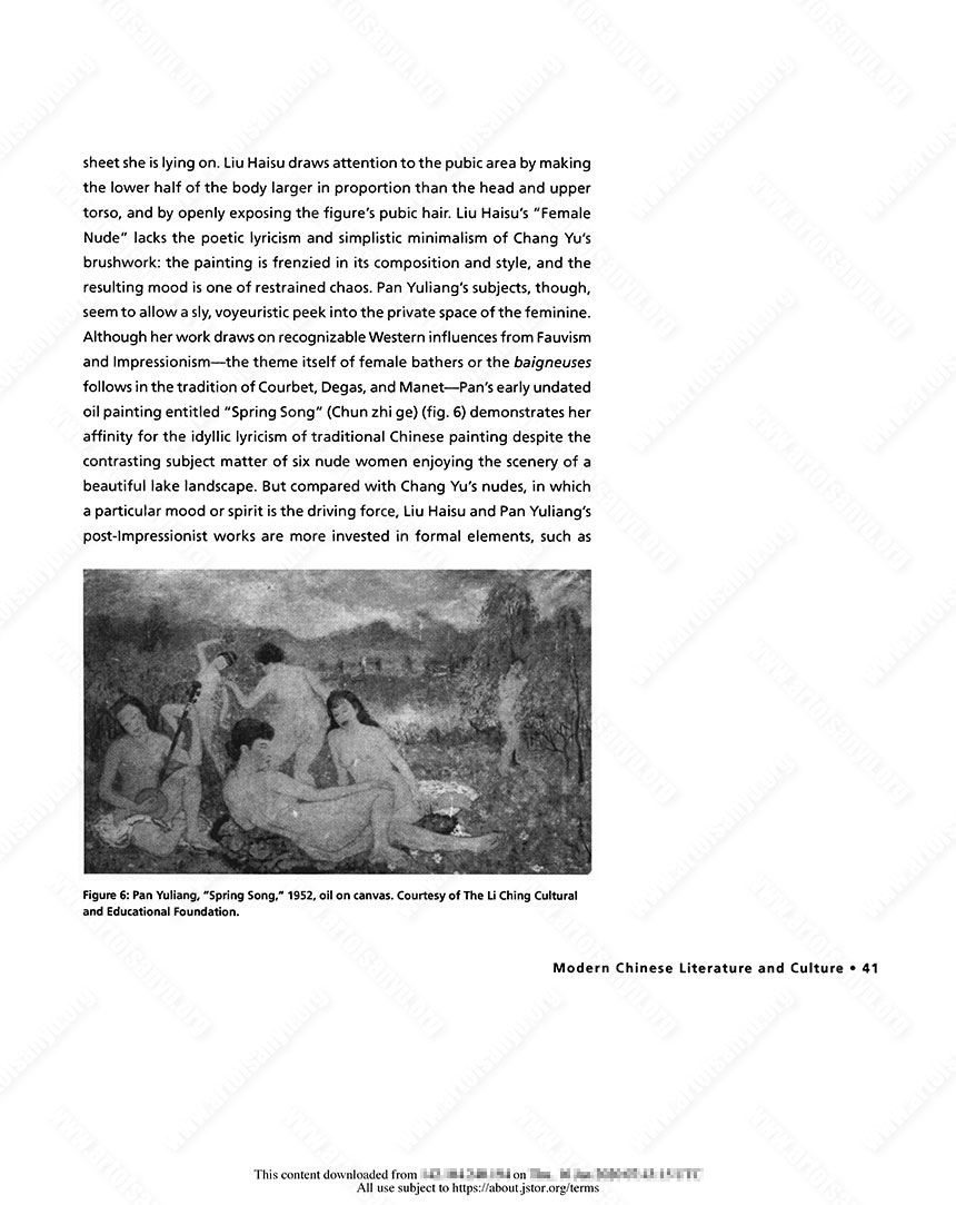 Begun in Paris and then completed in Shanghai the following year, Liu Haisu’s 1931 oil “Female Nude” displays similarities with the Fauvist works by artists such as Matisse, as seen, for example, in its use of striking colors and wild brush strokes. A well-balanced composition of light and dark, and figure and background, “Female Nude” features the frank gaze of a nude woman posing in front of a dark green, black, and brown geometrically zigzagging background that starkly contrasts with the nude body’s luminous and sinewy limbs and the folds of the crumpled white sheet she is lying on. Liu Haisu draws attention to the pubic area by making the lower half of the body larger in proportion than the head and upper torso, and by openly exposing the figure’s pubic hair. Liu Haisu’s “Female Nude” lacks the poetic lyricism and simplistic minimalism of Chang Yu’s brushwork: the painting is frenzied in its composition and style, and the resulting mood is one of restrained chaos. Pan Yuliang’s subjects, though, seem to allow a sly, voyeuristic peek into the private space of the feminine. Although her work draws on recognizable Western influences from Fauvism and Impressionism—the theme itself of female bathers or the baigneuses follows in the tradition of Courbet, Degas, and Manet—Pan’s early undated oil painting entitled “Spring Song” (Chun zhi ge) (fig. 6) demonstrates her affinity for the idyllic lyricism of traditional Chinese painting despite the contrasting subject matter of six nude women enjoying the scenery of a beautiful lake landscape. But compared with Chang Yu’s nudes, in which a particular mood or spirit is the driving force, Liu Haisu and Pan Yuliang’s post-Impressionist works are more invested in formal elements, such as capturing light and realistic color and using lines to define the anatomical parts of the female body, aesthetic concerns that Chang Yu completely overthrows in his visual language.