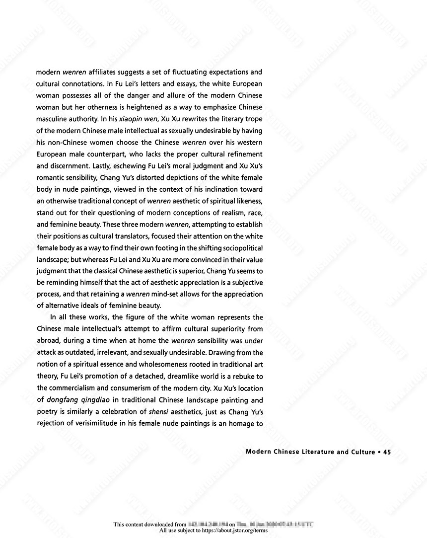 As the literati’s social status declined and their culture waned in the early twentieth century, wenren affiliates felt threatened by the rise of modernity and consumer culture in China. Here, the term “wenren affiliates” refers to those modern intellectuals who, in most cases, despite not having received formal training in the Confucian classics, calligraphy, and painting, were influenced by classical art and literature and attempted to represent literati culture and its aesthetics in their work. The modern intellectuals addressed in this essay intersect in their use of the ambivalent figure of the western European woman in their literature and art as a bodily site of experimentation, and their reliance on traditional Chinese art theory as the root of a spiritual sense of the self. I begin with a brief discussion of literary representations of white women from the late Qing through the 1920s and 1930s in order to examine the kinds of continuities that persisted and to identify new developments. The way in which male intellectuals during the Republican period viewed their social position in relationship to Western women shifted from the perspectives of late-Qing wenren travelers to France, such as the translator Wang Tao (1828–1897) and the diplomat Chen Jitong (1851–1907). During this time of significant cultural transformations, as the boundaries between the binaries of race and ethnicity (white vs. Asian, Chinese vs. French), gender roles (male vs. female), and temporal modalities (modern vs. traditional) grew increasingly blurred, Chinese male intellectuals located an ideal site for self-definition: by depicting the body of the white woman, the modern wenren could make out his own form by emphasizing what he was dearly not. In the essay, I explore the various cultural connotations of literati culture as a concept in flux during the Republican period and argue that this diverse group of modern wenren affiliates, from Fu Lei to Xu Xu to Chang Yu, used literary and visual representations of the white female body to reinforce their masculinity and to recover their displaced cultural and gender authority.