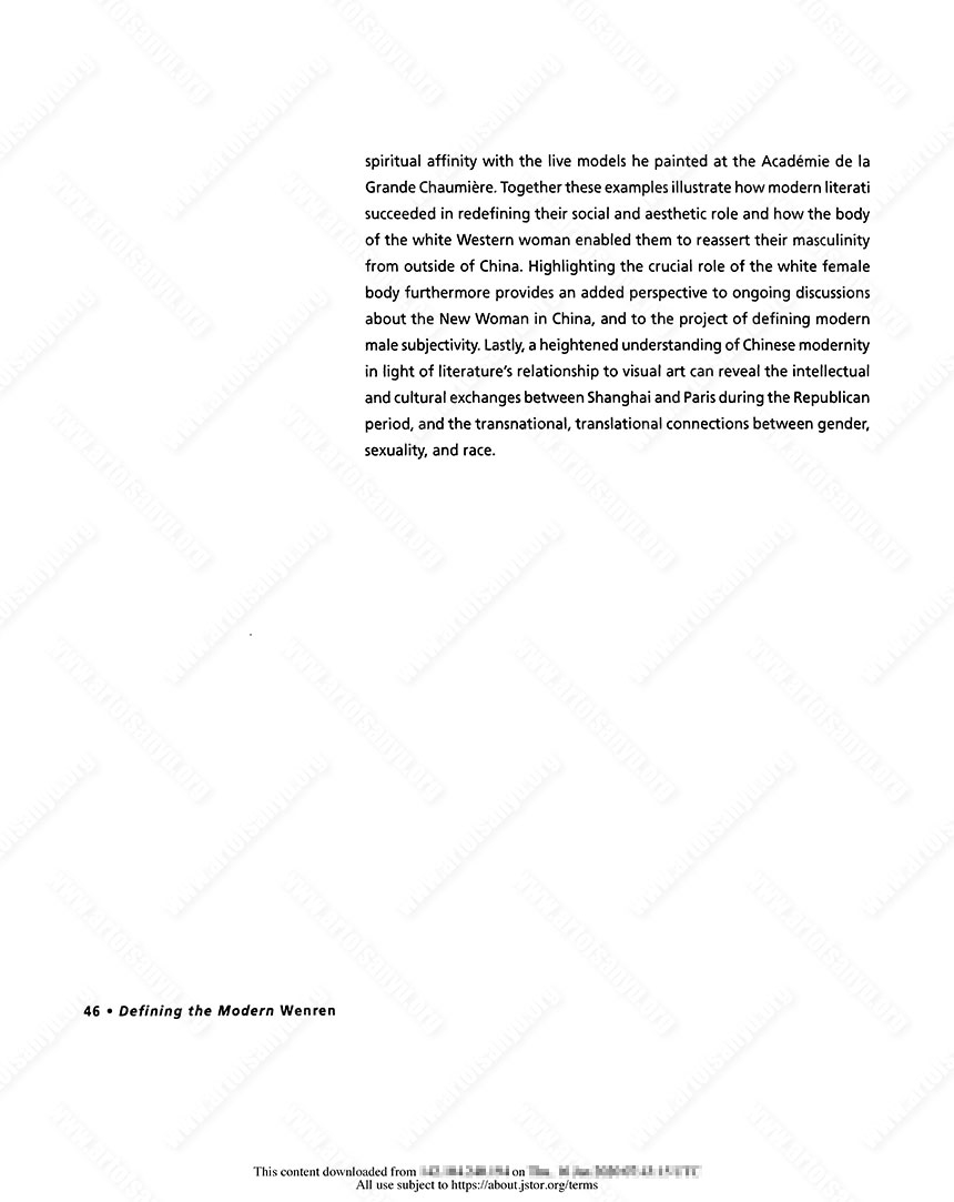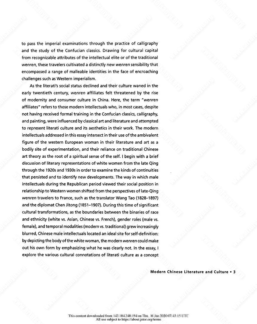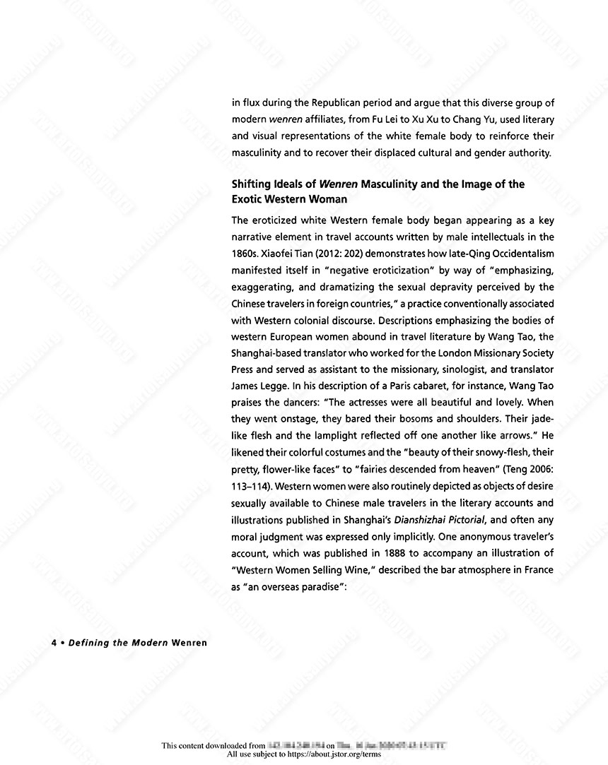 As the literati’s social status declined and their culture waned in the early twentieth century, wenren affiliates felt threatened by the rise of modernity and consumer culture in China. Here, the term “wenren affiliates” refers to those modern intellectuals who, in most cases, despite not having received formal training in the Confucian classics, calligraphy, and painting, were influenced by classical art and literature and attempted to represent literati culture and its aesthetics in their work. The modern intellectuals addressed in this essay intersect in their use of the ambivalent figure of the western European woman in their literature and art as a bodily site of experimentation, and their reliance on traditional Chinese art theory as the root of a spiritual sense of the self. I begin with a brief discussion of literary representations of white women from the late Qing through the 1920s and 1930s in order to examine the kinds of continuities that persisted and to identify new developments. The way in which male intellectuals during the Republican period viewed their social position in relationship to Western women shifted from the perspectives of late-Qing wenren travelers to France, such as the translator Wang Tao (1828–1897) and the diplomat Chen Jitong (1851–1907). During this time of significant cultural transformations, as the boundaries between the binaries of race and ethnicity (white vs. Asian, Chinese vs. French), gender roles (male vs. female), and temporal modalities (modern vs. traditional) grew increasingly blurred, Chinese male intellectuals located an ideal site for self-definition: by depicting the body of the white woman, the modern wenren could make out his own form by emphasizing what he was dearly not. In the essay, I explore the various cultural connotations of literati culture as a concept in flux during the Republican period and argue that this diverse group of modern wenren affiliates, from Fu Lei to Xu Xu to Chang Yu, used literary and visual representations of the white female body to reinforce their masculinity and to recover their displaced cultural and gender authority.
