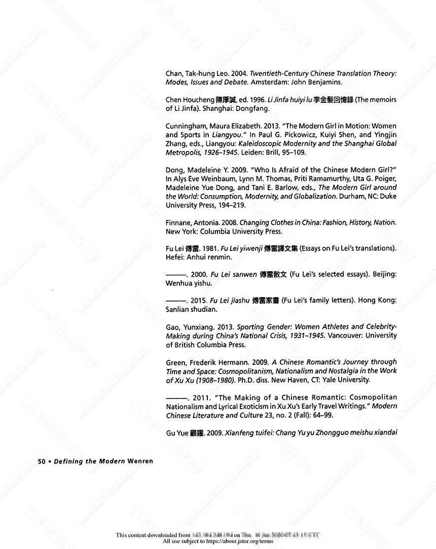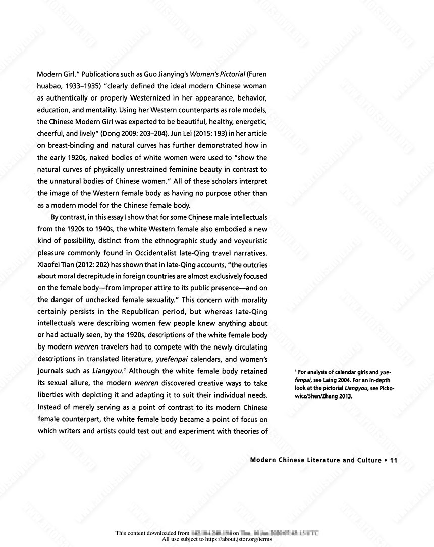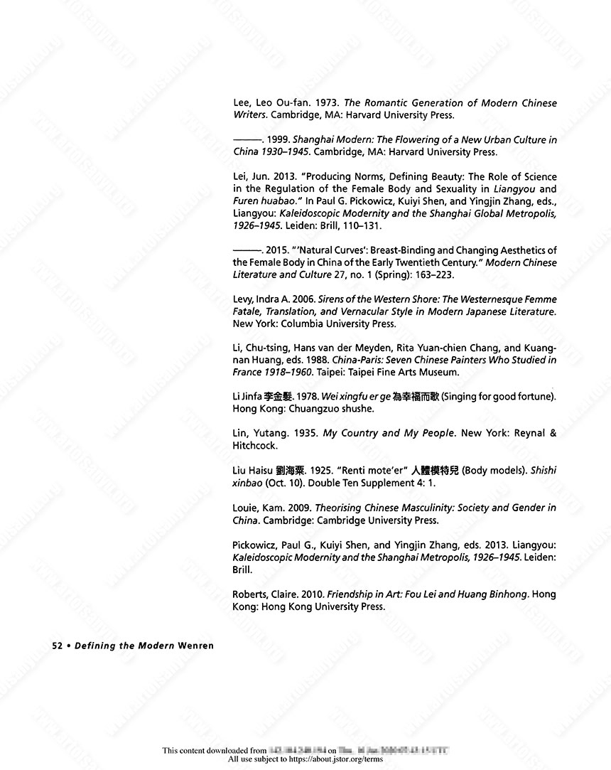 Lei, Jun. 2013. “Producing Norms, Defining Beauty: The Role of Science in the Regulation of the Female Body and Sexuality in Liangyou and Furen huabao.” In Paul G. Pickowicz, Kuiyi Shen, and Yingjin Zhang, eds., Liangyou: Kaleidoscopic Modernity and the Shanghai Global Metropolis, 1926–1945. Leiden: Brill, 110–131.
