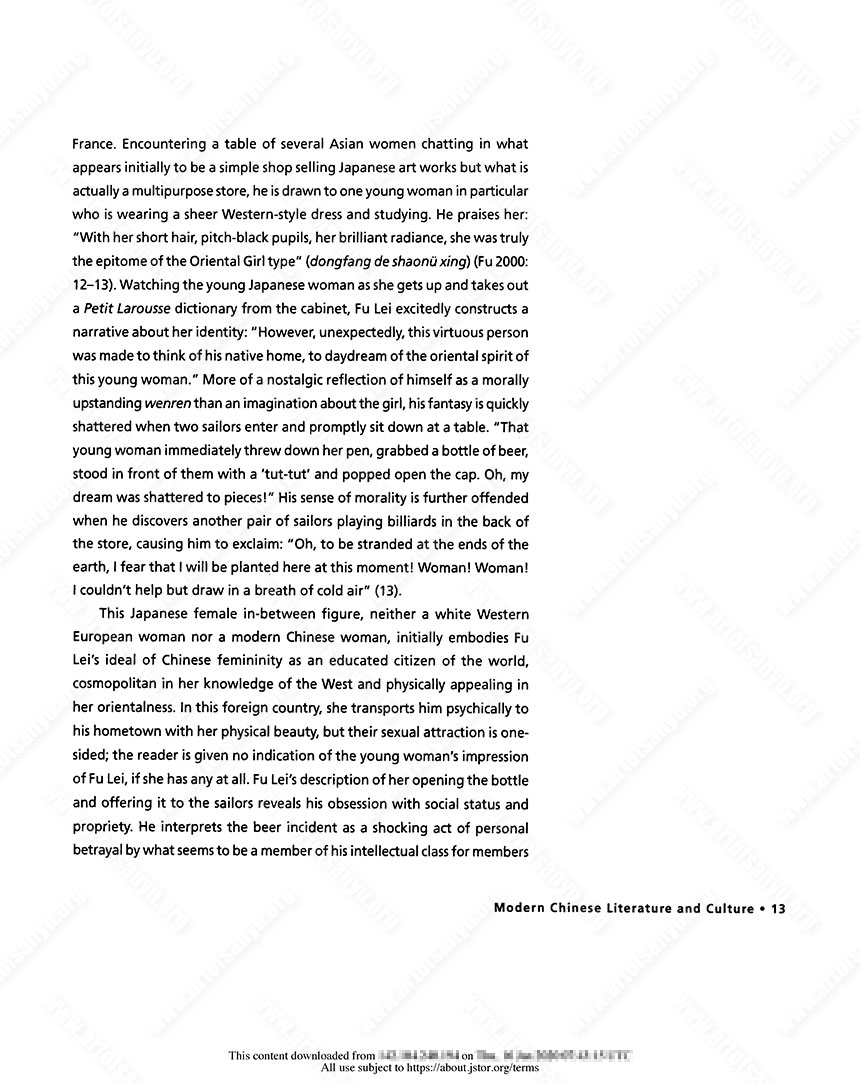 This Japanese female in-between figure, neither a white Western European woman nor a modern Chinese woman, initially embodies Fu Lei’s ideal of Chinese femininity as an educated citizen of the world, cosmopolitan in her knowledge of the West and physically appealing in her orientalness. In this foreign country, she transports him psychically to his hometown with her physical beauty, but their sexual attraction is one sided; the reader is given no indication of the young woman’s impression of Fu Lei, if she has any at all. Fu Lei’s description of her opening the bottle and offering it to the sailors reveals his obsession with social status and propriety. He interprets the beer incident as a shocking act of personal betrayal by what seems to be a member of his intellectual class for members of a lower social class. Reminiscent of the Japanese women in narratives such as Yu Dafu’s 1921 short story “Sinking” (the schoolgirls in the street, the innkeeper’s daughter, the waitress at the brothel) who provoke the protagonist’s feelings of inferiority, in this account the Japanese woman reveals Fu Lei’s anxiety about the opposite sex and about his own sexual desirability; although the young woman may appear enlightened and modern, she cannot transcend her deceitful feminine nature simply through education. Her Japanese ethnicity further complicates his horror: he seems at first to consider her a familiar, recognizable type under the category of oriental, but once the young woman reveals her true nature as sexually open to the sailors, she comes to represent the duplicity of all women. In effect, the narrative transforms from an idealized scene of wenren civility (the essay’s title evokes the nostalgic, dreamy mood of a scholar thinking of his hometown) to a nightmare in which the embodiment of feminine beauty chooses a group of boorish sailors over the genteel modern intellectual that Fu Lei believes himself to be.