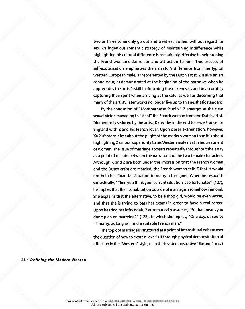 By the conclusion of “Montparnasse Studio,” Z emerges as the clear sexual victor, managing to “steal” the French woman from the Dutch artist. Momentarily seduced by the artist, K decides in the end to leave France for England with Z and his French lover. Upon closer examination, however, Xu Xu’s story is less about the plight of the modern woman than it is about highlighting Z’s moral superiority to his Western male rival in his treatment of women. The issue of marriage appears repeatedly throughout the essay as a point of debate between the narrator and the two female characters. Although K and Z are both under the impression that the French woman and the Dutch artist are married, the French woman tells Z that it would not help her financial situation to marry a foreigner. When he responds sarcastically, “Then you think your current situation is so fortunate?” (127), he implies that their cohabitation outside of marriage is somehow immoral. She explains that the alternative, to be a shop girl, would be even worse, and that she is trying to pass her exams in order to have a real career. Upon hearing her lofty goals, Z automatically assumes, “So that means you don’t plan on marrying?” (128), to which she replies, “One day, of course I’ll marry, as long as I find a suitable French man.”