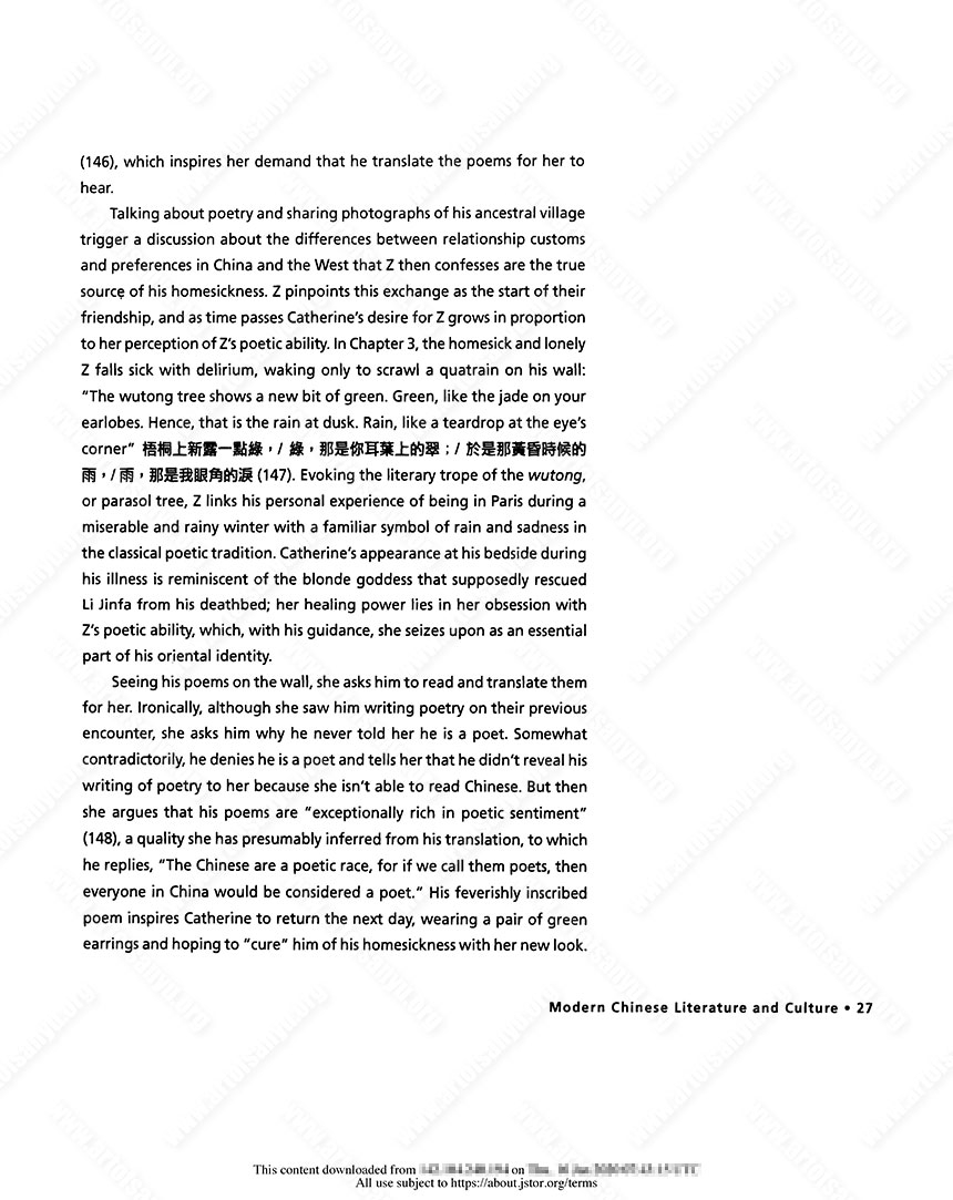 Talking about poetry and sharing photographs of his ancestral village trigger a discussion about the differences between relationship customs and preferences in China and the West that Z then confesses are the true source of his homesickness. Z pinpoints this exchange as the start of their friendship, and as time passes Catherine’s desire for Z grows in proportion to her perception of Z’s poetic ability. In Chapter 3, the homesick and lonely Z falls sick with delirium, waking only to scrawl a quatrain on his wall: “The wutong tree shows a new bit of green. Green, like the jade on your earlobes. Hence, that is the rain at dusk. Rain, like a teardrop at the eye’s corner” 梧桐上新露ー點綠,/ 綠,那是你耳葉上的翠;/ 於是那黃昏時候的 雨,/ 雨,那是我眼角的涙 (147). Evoking the literary trope of the wutong, or parasol tree, Z links his personal experience of being in Paris during a miserable and rainy winter with a familiar symbol of rain and sadness in the classical poetic tradition. Catherine’s appearance at his bedside during his illness is reminiscent of the blonde goddess that supposedly rescued Li Jinfa from his deathbed; her healing power lies in her obsession with Z’s poetic ability, which, with his guidance, she seizes upon as an essential part of his oriental identity.