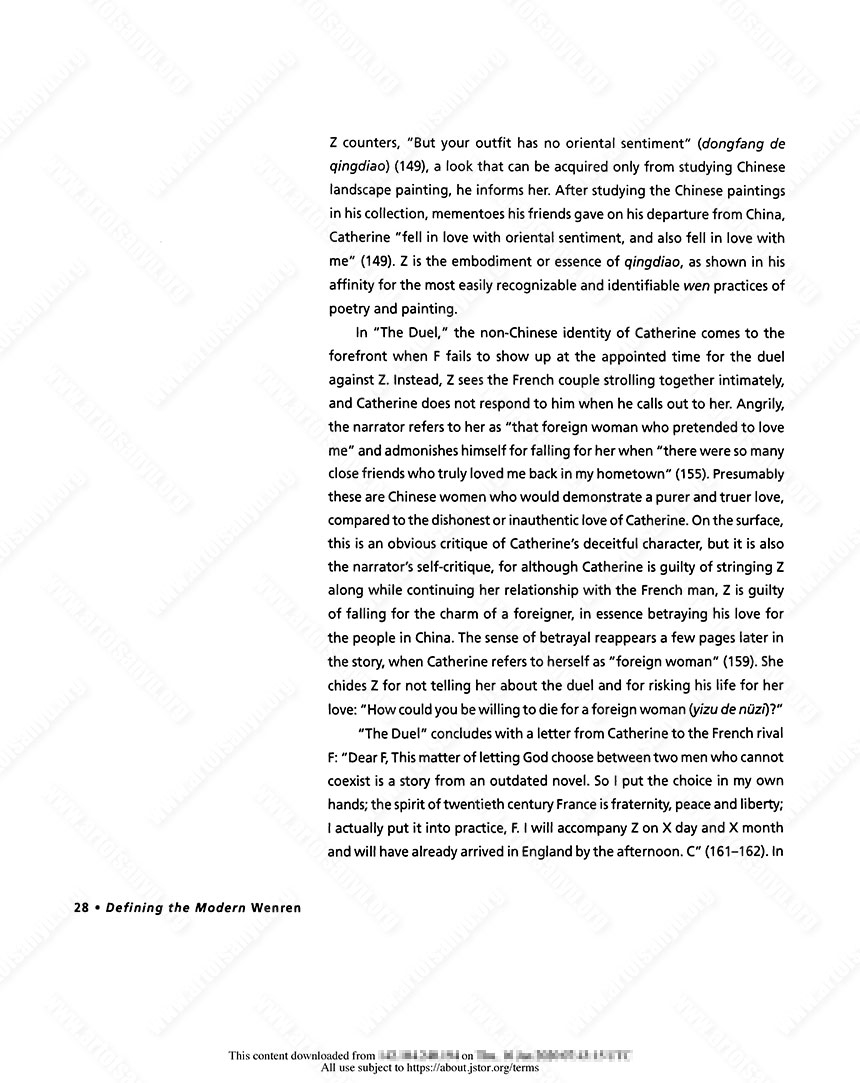 In “The Duel,” the non-Chinese identity of Catherine comes to the forefront when F fails to show up at the appointed time for the duel against Z. Instead, Z sees the French couple strolling together intimately, and Catherine does not respond to him when he calls out to her. Angrily, the narrator refers to her as “that foreign woman who pretended to love me” and admonishes himself for falling for her when “there were so many close friends who truly loved me back in my hometown” (155). Presumably these are Chinese women who would demonstrate a purer and truer love, compared to the dishonest or inauthentic love of Catherine. On the surface, this is an obvious critique of Catherine’s deceitful character, but it is also the narrator’s self-critique, for although Catherine is guilty of stringing Z along while continuing her relationship with the French man, Z is guilty of falling for the charm of a foreigner, in essence betraying his love for the people in China. The sense of betrayal reappears a few pages later in the story, when Catherine refers to herself as “foreign woman” (159). She chides Z for not telling her about the duel and for risking his life for her love: “How could you be willing to die for a foreign woman (yizu de nüzi)?”
