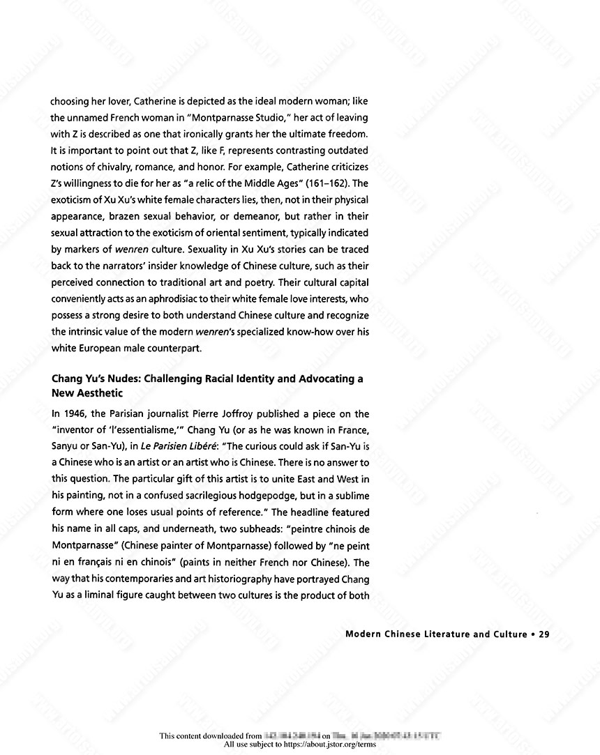 “The Duel” concludes with a letter from Catherine to the French rival F: “Dear F, This matter of letting God choose between two men who cannot coexist is a story from an outdated novel. So I put the choice in my own hands; the spirit of twentieth century France is fraternity, peace and liberty; I actually put it into practice, F. I will accompany Z on X day and X month and will have already arrived in England by the afternoon. C” (161–162). In choosing her lover, Catherine is depicted as the ideal modern woman; like the unnamed French woman in “Montparnasse Studio,” her act of leaving with Z is described as one that ironically grants her the ultimate freedom. It is important to point out that Z, like F, represents contrasting outdated notions of chivalry, romance, and honor. For example, Catherine criticizes Z’s willingness to die for her as “a relic of the Middle Ages” (161–162). The exoticism of Xu Xu’s white female characters lies, then, not in their physical appearance, brazen sexual behavior, or demeanor, but rather in their sexual attraction to the exoticism of oriental sentiment, typically indicated by markers of wenren culture. Sexuality in Xu Xu’s stories can be traced back to the narrators’ insider knowledge of Chinese culture, such as their perceived connection to traditional art and poetry. Their cultural capital conveniently acts as an aphrodisiac to their white female love interests, who possess a strong desire to both understand Chinese culture and recognize the intrinsic value of the modern wenren’s specialized know-how over his white European male counterpart.