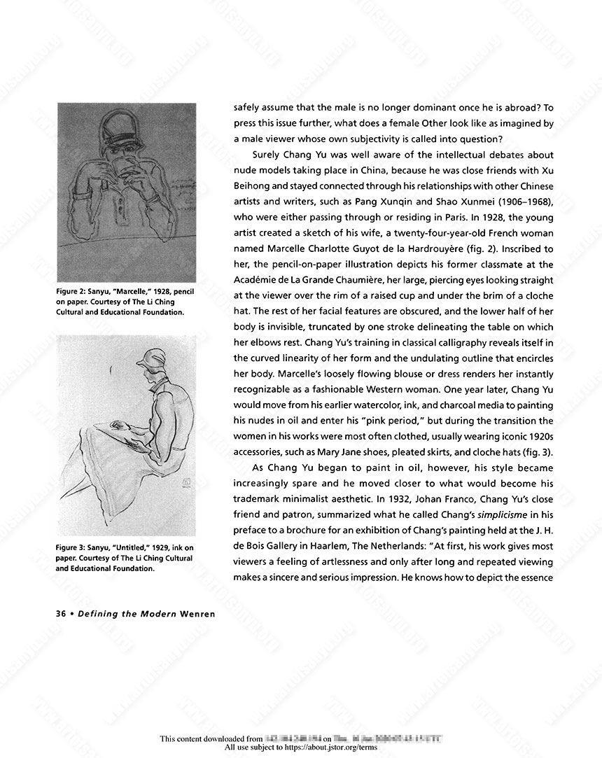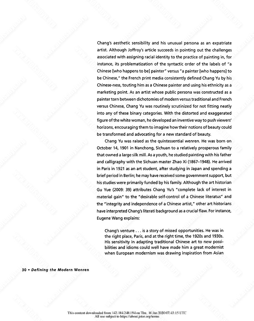 Along with Pan Yuliang (1899–1977), who also remained in Paris, Chang Yu was an exception among the Chinese artists who studied abroad in the West. His “failure” has been explained by way of his eccentric personality and his bohemian lifestyle, and his consorting with Parisian “locals” and contemporary Western artists, implying his isolation from Chinese contemporaries. To read Chang Yu’s lack of financial success (and therefore career) as one of “missed opportunities” loses sight of the key role that his wenren sensibility played in his artistic choices.