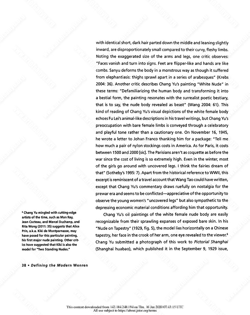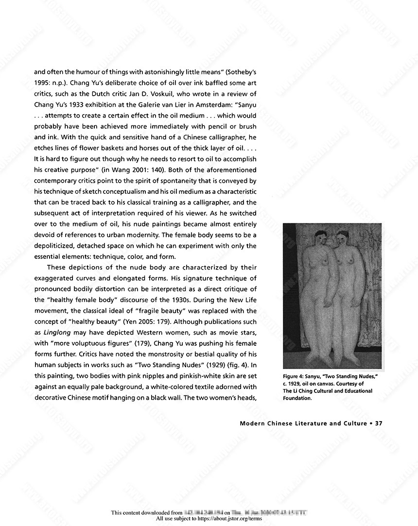 In this essay, I have shown how the figure of the white female was depicted in various ways by modern Chinese male writers and painters who traveled abroad, during a time when the Chinese public was already exposed to numerous images of the white Western female body in popular print culture and commercial art. Compared to their earlier predecessors, such as the late-Qing travelers Chen Jitong and Wang Tao, the category of modern wenren affiliates suggests a set of fluctuating expectations and cultural connotations. In Fu Lei’s letters and essays, the white European woman possesses all of the danger and allure of the modern Chinese woman but her otherness is heightened as a way to emphasize Chinese masculine authority. In his xiaopin wen, Xu Xu rewrites the literary trope of the modern Chinese male intellectual as sexually undesirable by having his non-Chinese women choose the Chinese wenren over his western European male counterpart, who lacks the proper cultural refinement and discernment. Lastly, eschewing Fu Lei’s moral judgment and Xu Xu’s romantic sensibility, Chang Yu’s distorted depictions of the white female body in nude paintings, viewed in the context of his inclination toward an otherwise traditional concept of wenren aesthetic of spiritual likeness, stand out for their questioning of modern conceptions of realism, race, and feminine beauty. These three modern wenren, attempting to establish their positions as cultural translators, focused their attention on the white female body as a way to find their own footing in the shifting sociopolitical landscape; but whereas Fu Lei and Xu Xu are more convinced in their value judgment that the classical Chinese aesthetic is superior, Chang Yu seems to be reminding himself that the act of aesthetic appreciation is a subjective process, and that retaining a wenren mind-set allows for the appreciation of alternative ideals of feminine beauty.