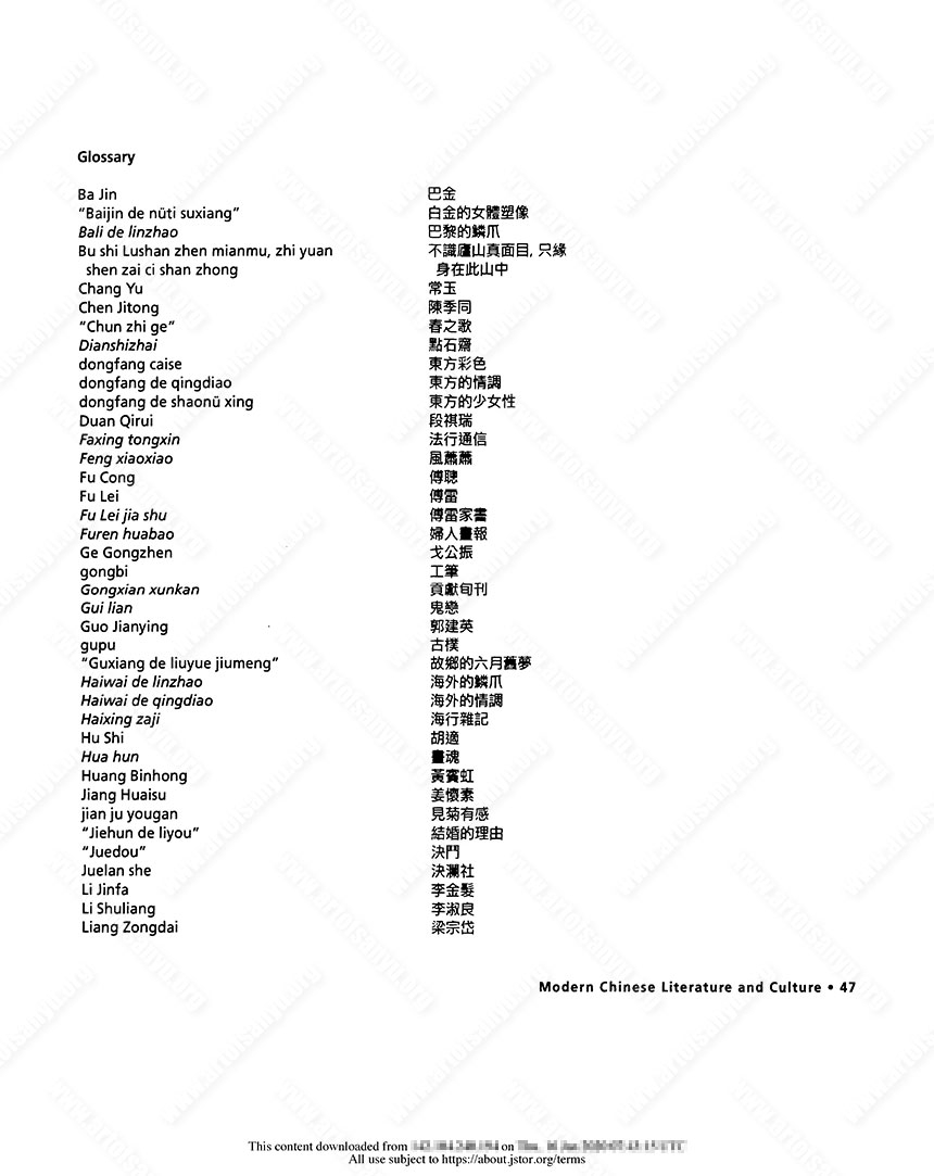 Shih, Shu-mei. 2001. The Lure of the Modem: Writing Modernism in Semicolonial China, 1917–1937. Berkeley: University of California Press.