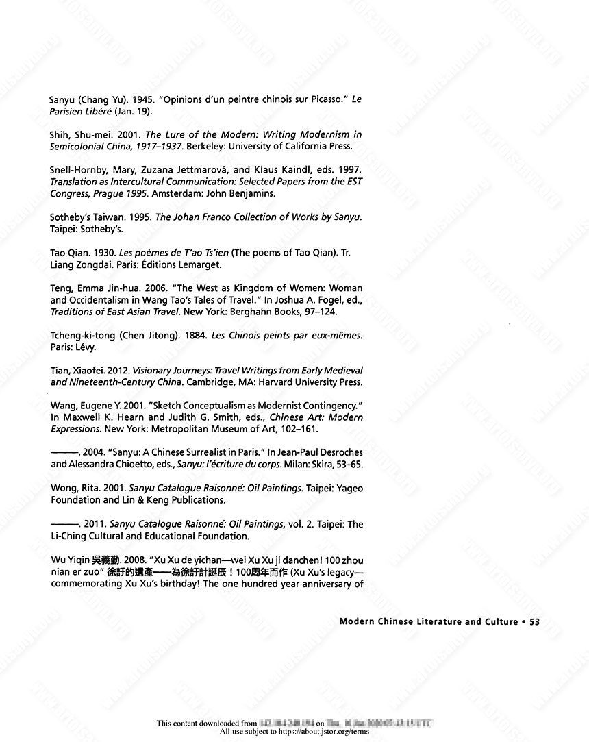 Jones, Leslie. 1999. “Sanyu: Chinese Painter of Montparnasse.” RES: Anthropology and Aesthetics 35 (Spring): 224–239.