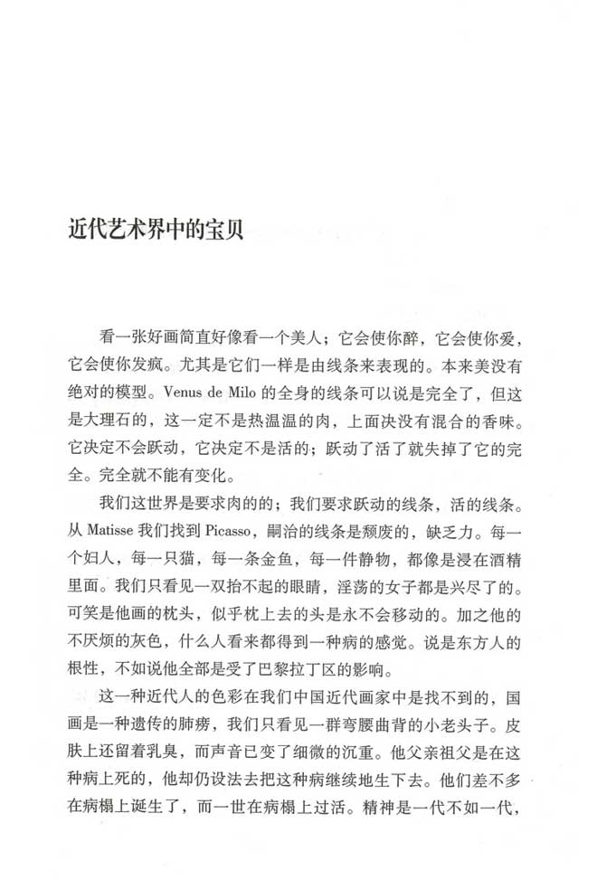 我們這世界是要求肉的;我們要求躍動的線條,活的線條。從Matisse我們找到Picasso,嗣治的線條是頹廢的,缺乏力。每一個婦人,每一隻貓,每一條金魚,每一件靜物,都像是浸在酒精裡面。我們祇看見一雙抬不起的眼睛,淫蕩的女子都是興盡了的。可笑是他畫的枕頭,似乎枕上去的頭是永不會移動的。加之他的不厭煩的灰色,什麼人看來都得到一種病的感覺。說是東方人的根性,不如說他全部是受了巴黎拉丁區的影響。